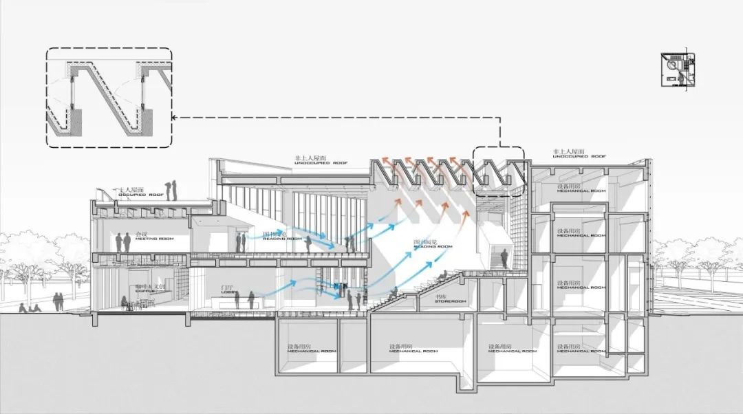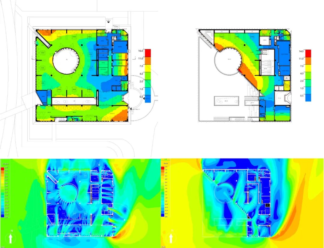 建筑在创作之初即期望以一种主动的姿态去融入环境,在对场地的基本风光热环境模拟基础上,通过空间节能的理念去塑造建筑的内外部形态,在不用的季节主动地,有选择的接纳或者屏蔽外部的自然能量,通过空间自我调蓄的能力,达到运行阶段降碳节能的目的。例如在过渡季,利用热压通风和诱导通风的原理,加强气流在室内的流动,实现适宜室内温度控制;针对目前图书馆内用光过度、眩光及光污染等问题,建筑布局将阅读区布置在建筑内部围绕月庭布置,同时外立面通过织物幕墙的设置大大降低了光线的直射,形成非常适宜光环境。
