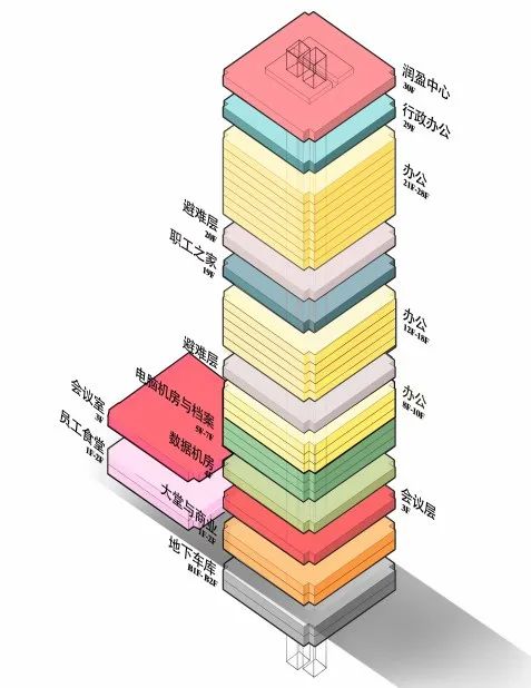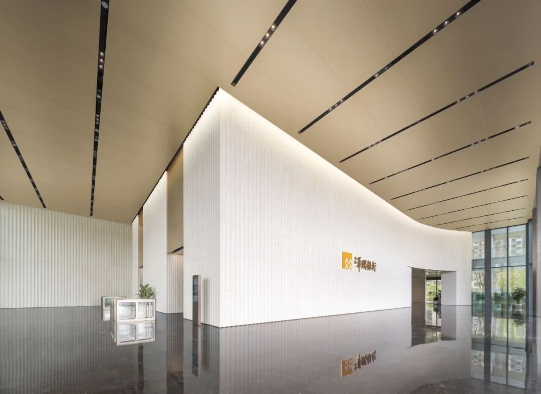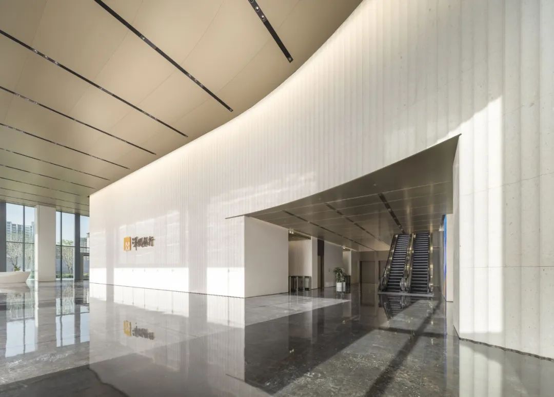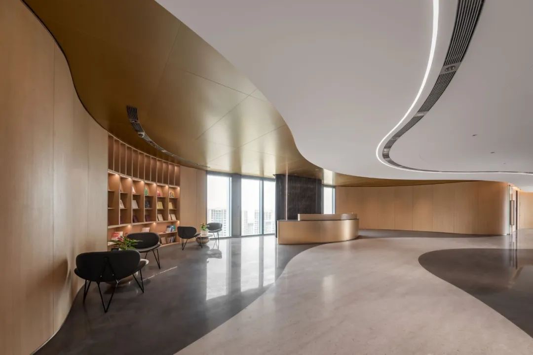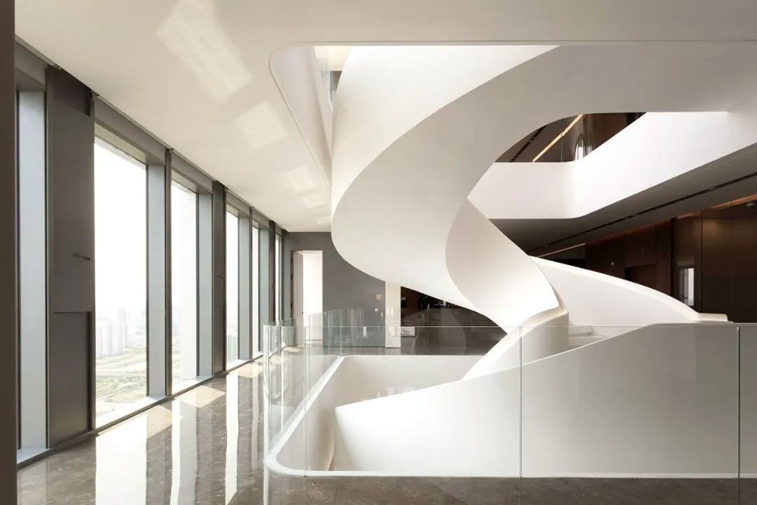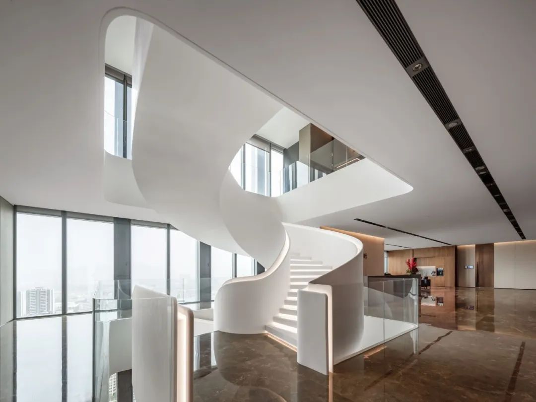 行政办公层与润盈中心通过温润且具有艺术感的旋转楼梯巧妙贯通,润盈中心作为企业展示及接待服务场所,创造多样化商务洽谈空间。