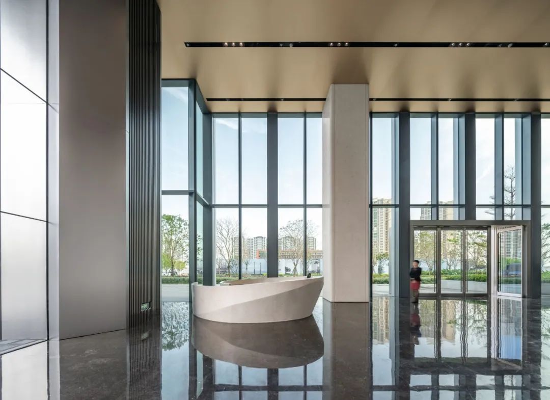 双层挑高的大堂以“石”为材,奠定了珠海华润银行坚实而亲人的品牌气质。不同于传统写字楼接待台正对入口的设计,华润银行大厦突破性地完整展现了长达30米的气派形象面,大面积的玻璃幕墙更为室内引入充足的自然采光,创造了明亮通达的公共空间。置于大堂西北角的接待台摒弃了石材片材的做法,采用原石整雕,打造出跨度超4米的双曲面艺术造型服务台。