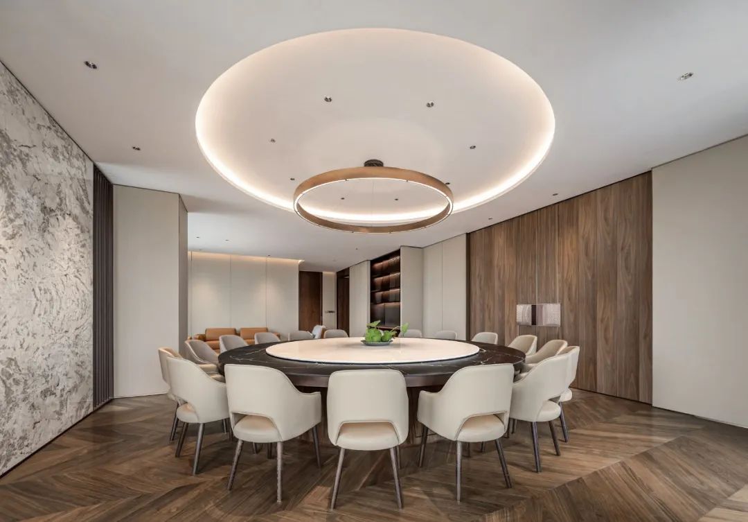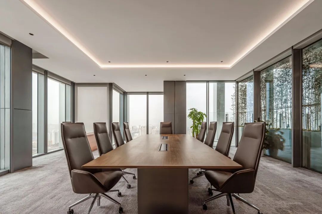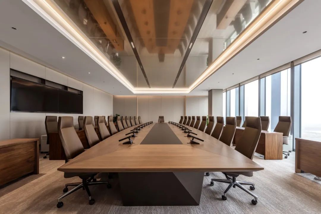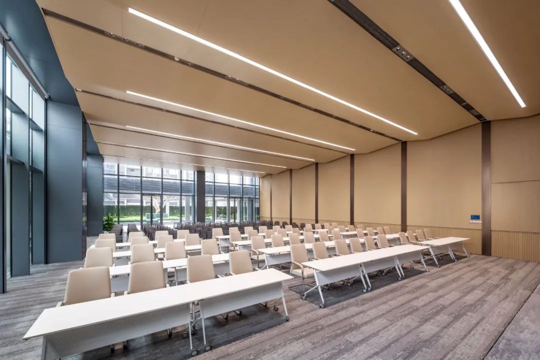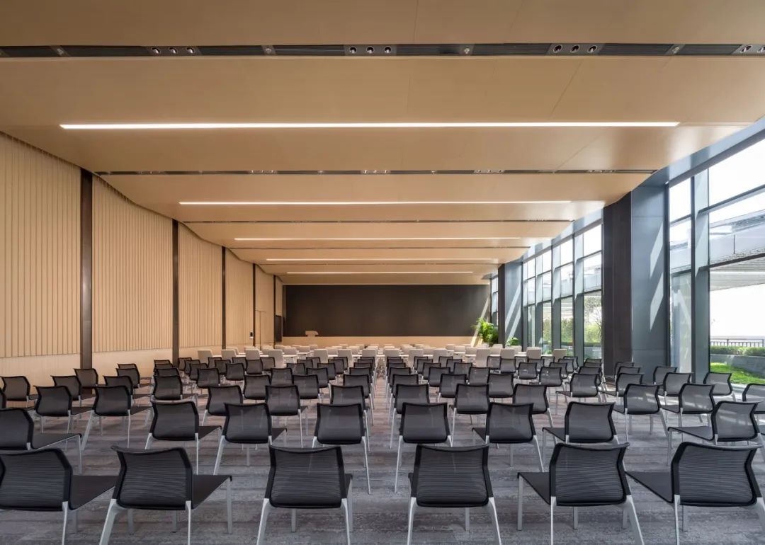 会议中心配置多类型视频会议室及一个大型多功能会议厅。其中多功能厅与户外露台花园直接相连,采用全面屏设计,以智慧系统进行一体式与分屏的切换显示,满足不同功能场景的多样需求。室内天花与墙面折线造型呼应华润的品牌logo,于细微之处展现企业形象。