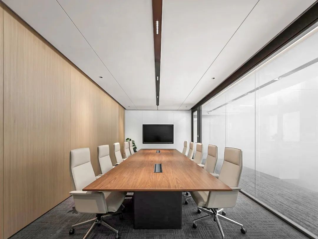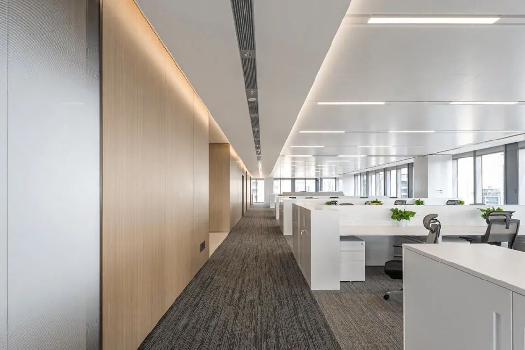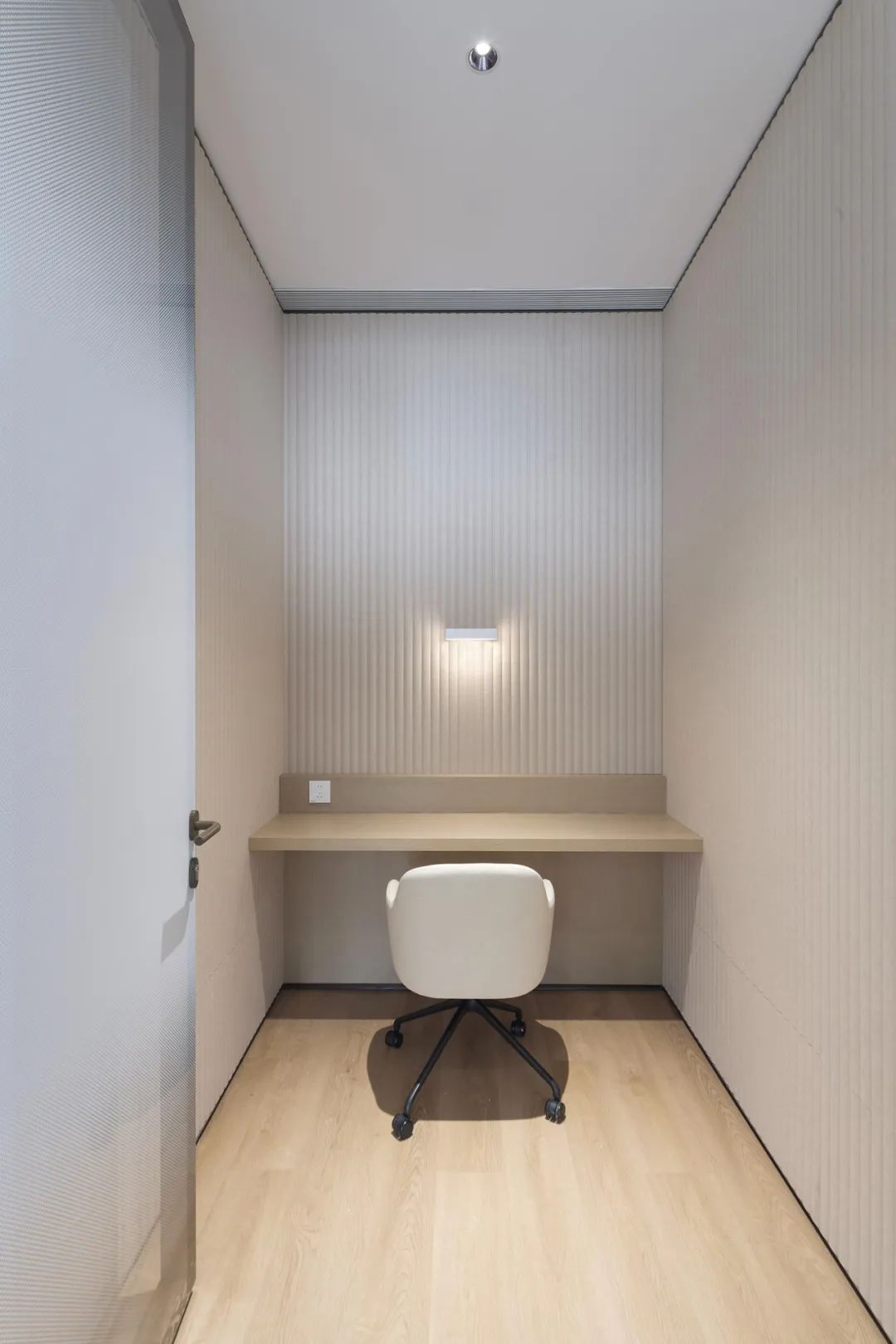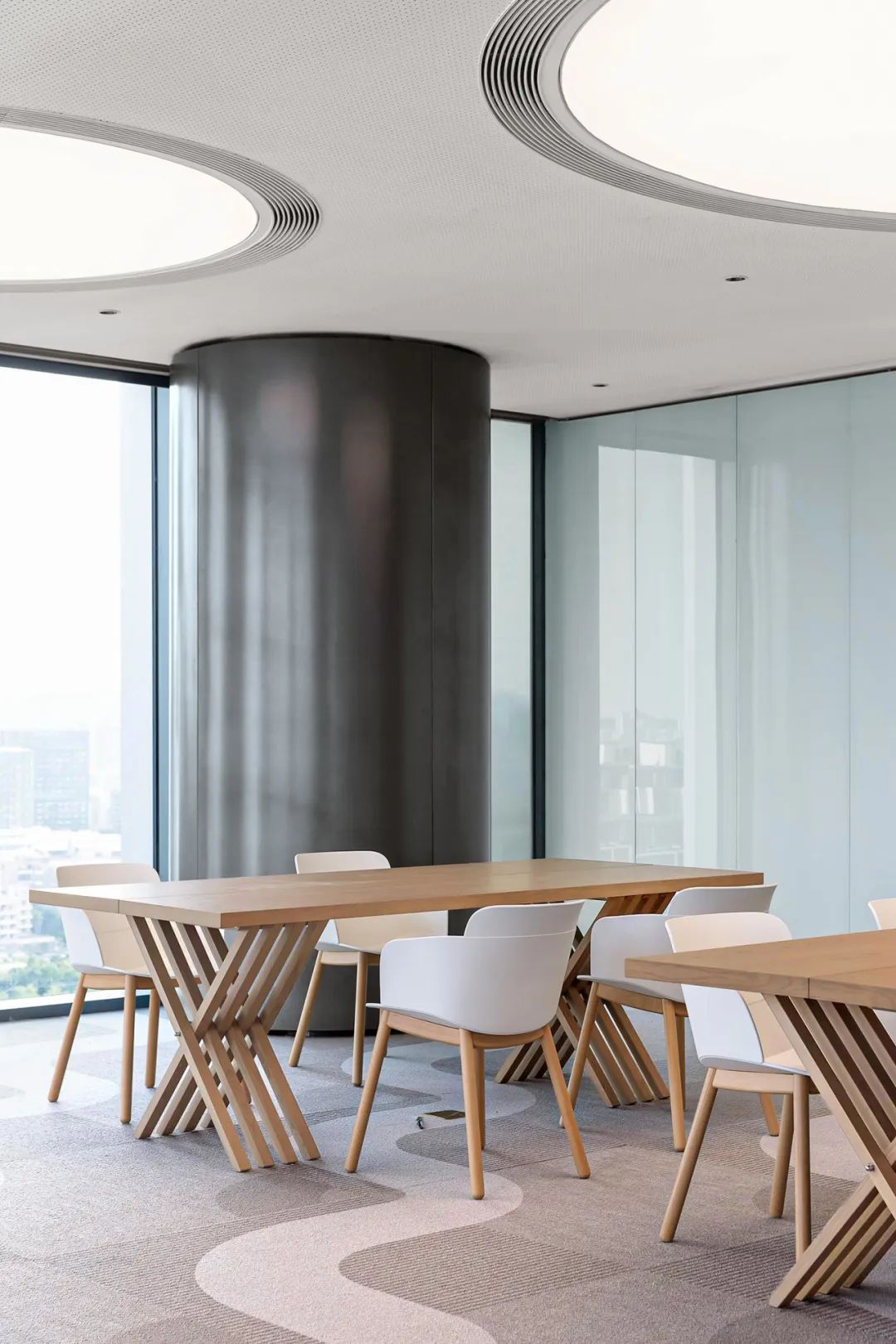 开放办公区将员工的健康与福祉作为基本驱动力,办公工位实现定制化设计,融合人体工程学语言,并集办公、休憩与多样化收纳于一体。天花风口的设计上,将风口与照明灯具完美结合,采用宽口斜向导流风口,规避空调直吹,大大提升了人体舒适度。各类会议室配备线上预约系统、智慧屏幕、感应装置等智能无接触解决方案,全方位提高工作效率。