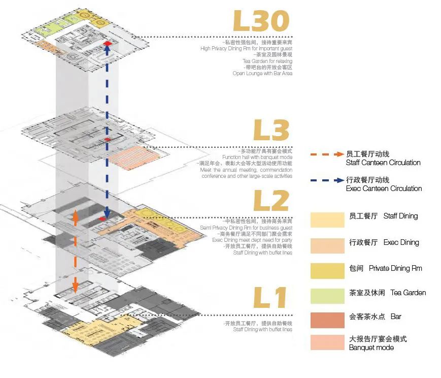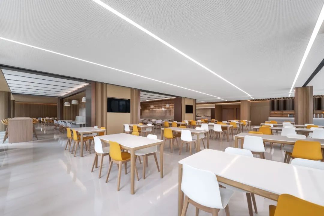 总部的餐厅设计采用员工和行政分流的动线规划,并根据不同使用场景设置从开放式到私密式的多样化餐饮空间。员工餐厅位于一二层,可从大堂直接进入,这里是一个生态健康的用餐环境,明亮的黄色作为华润品牌的主题色,跳跃穿插于空间之中,清新活泼的同时点燃华润形象。二层设置行政餐厅,注重功能多样性,满足不同场景下的用餐需求;三层的多功能厅可灵活转换成宴会模式。