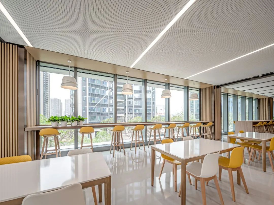 位于19层的职工之家设置运动区、文娱区及健康休闲区,以软性隔断及地面材质灵活划分,游走曲线随不同体验内容延展,增强空间流动性,明亮的色彩增添灵动与活力,创造Z时代办公体验,满足下班之余的健身、休闲、放松与社交需求,进一步促进员工身心健康与协作互动。
