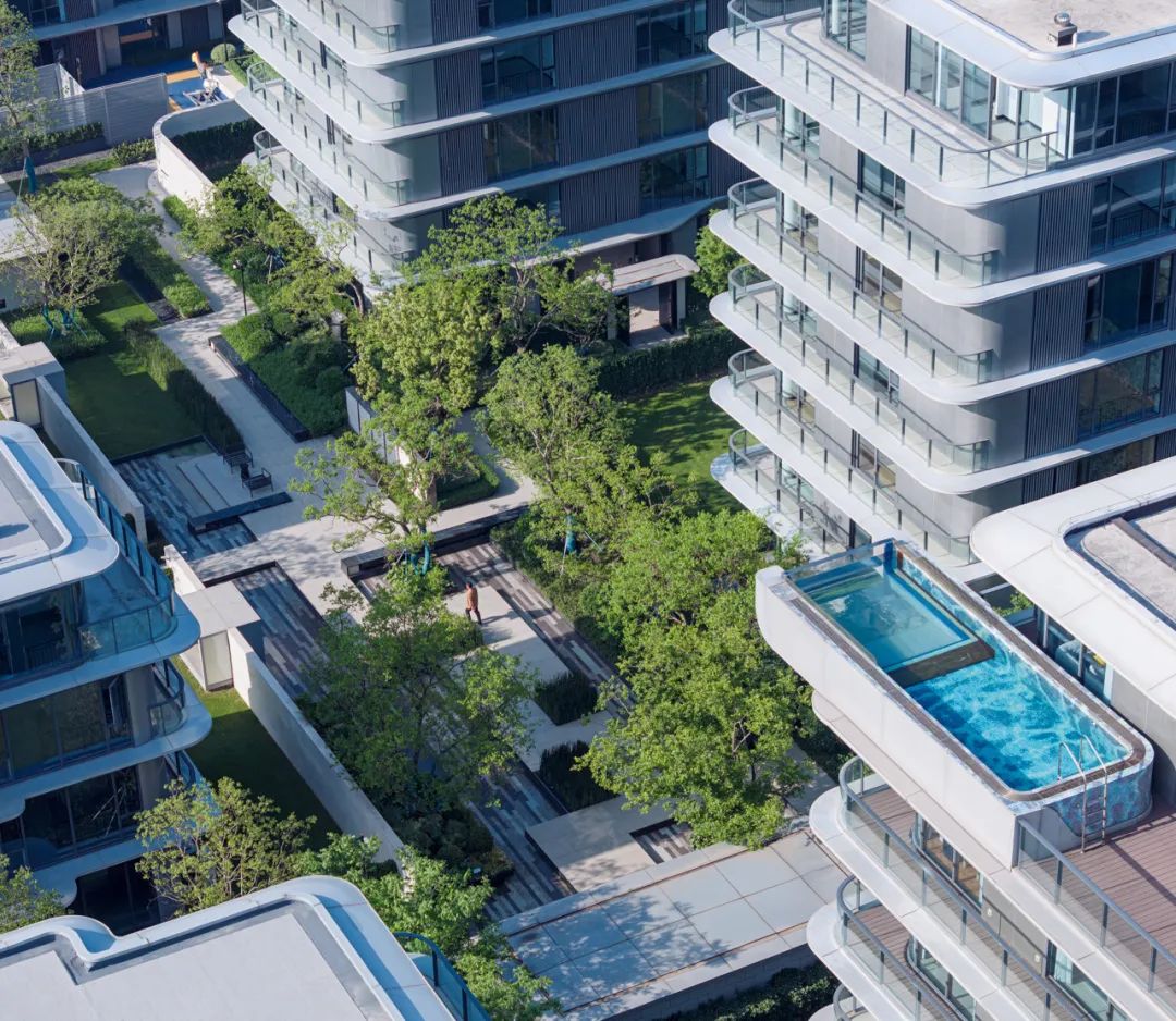 在叠排住宅的顶层,设计团队大胆引入空中泳池的概念,营造出兼具视觉冲击力与居住品质的标志性场景。无边界泳池与城市天际线自然融合,粼粼波光映照于纯白立面之上,将“自然浸润”的设计理念推向极致,营造出一种轻盈、松弛而充满仪式感的度假式生活体验。