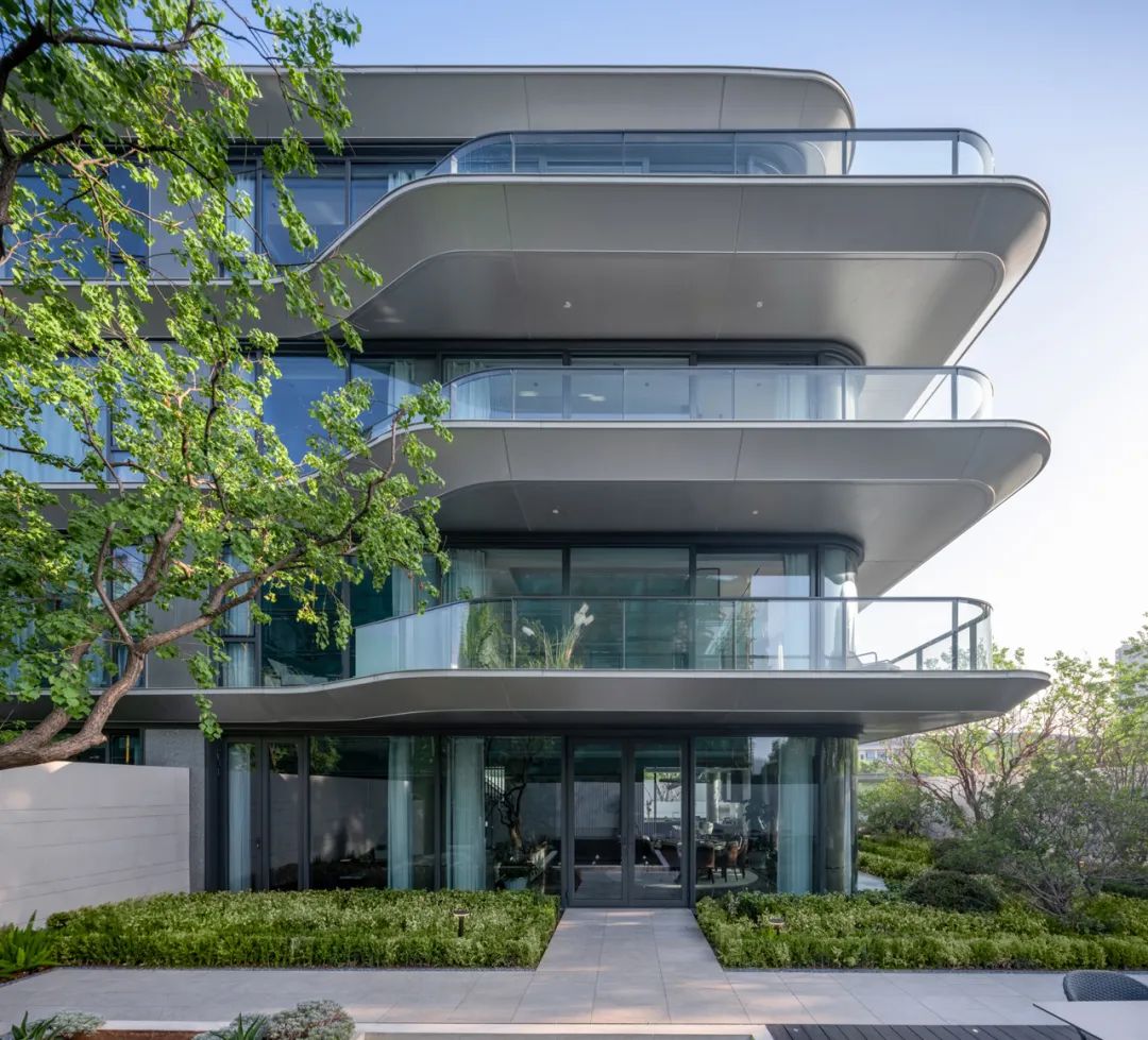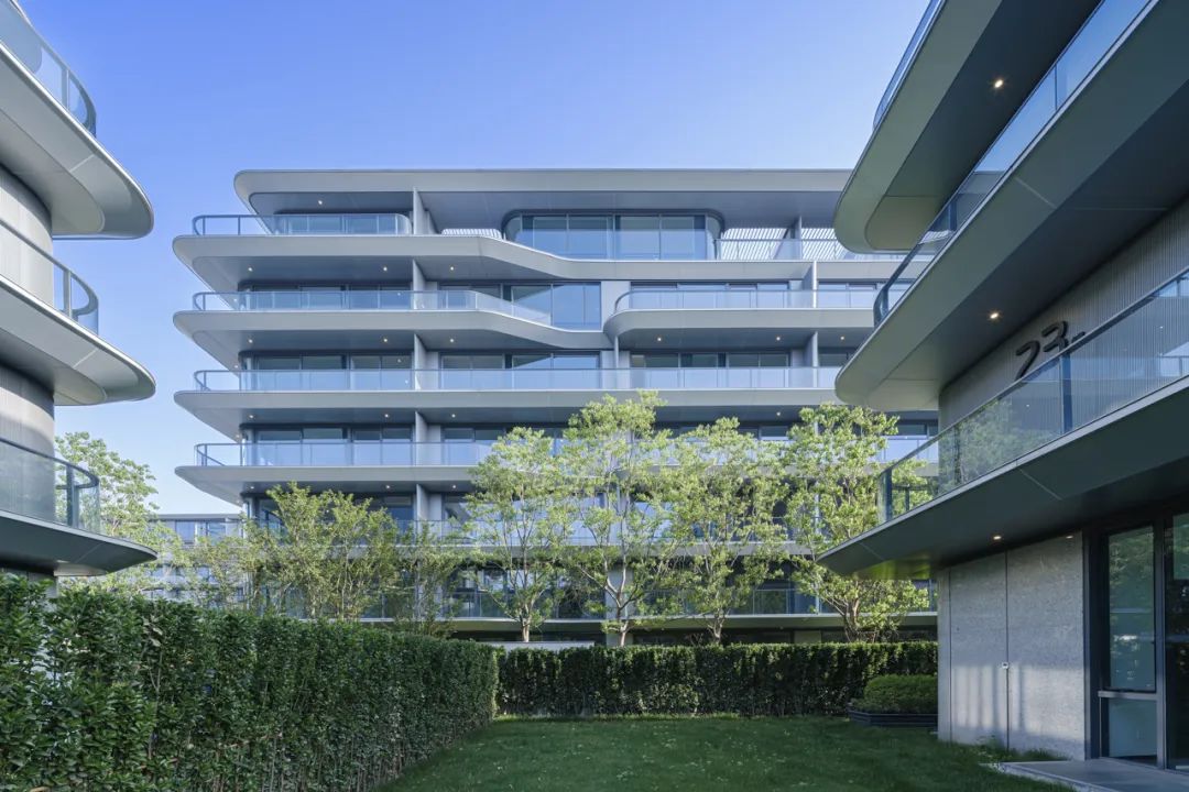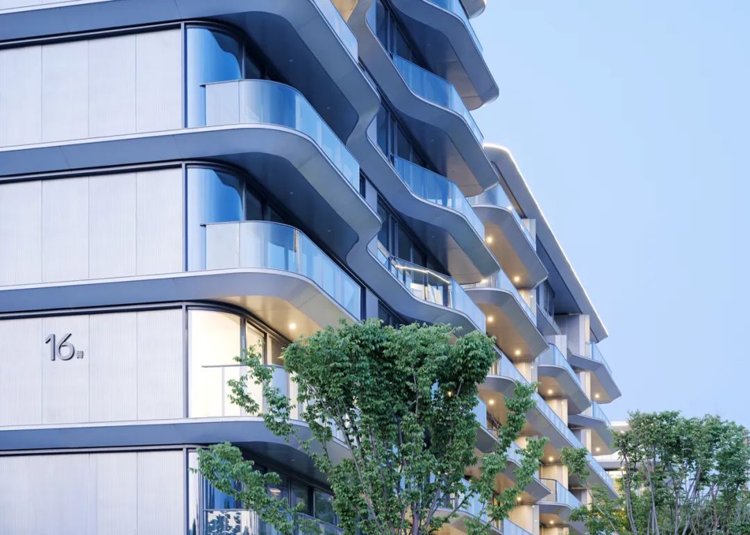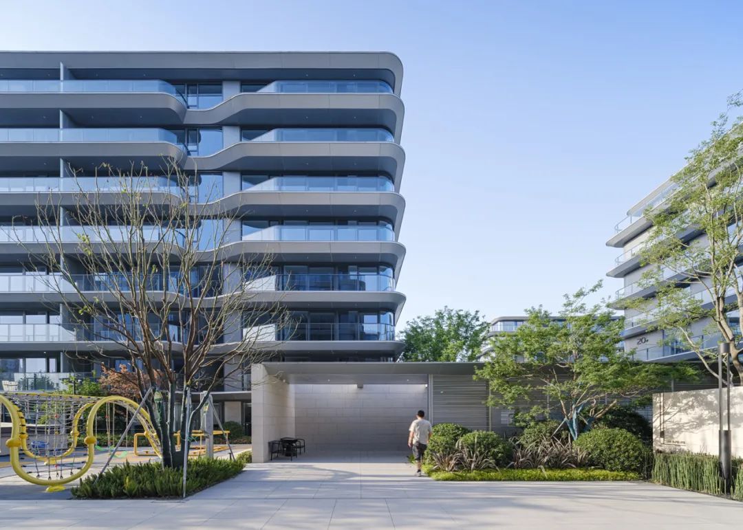 建筑立面采用连续的白色铝板勾勒体块轮廓,贯穿不同组团与楼栋,形成统一而流畅的界面语言。铝板的延展性与纯净感不仅强化了建筑的线性节奏,也在视觉上织就出整体性的住区风貌,使整个社区在多样化产品形态中依然保持高度一致的设计气质与识别度。