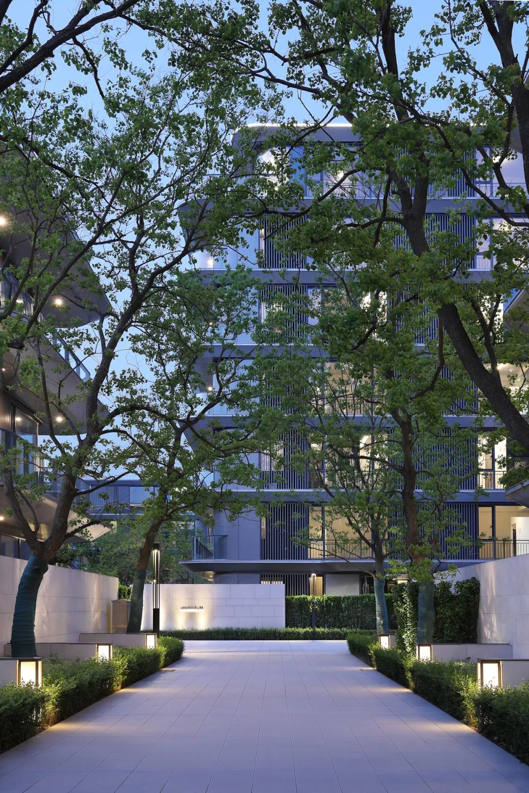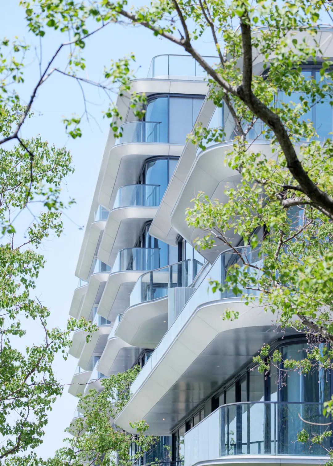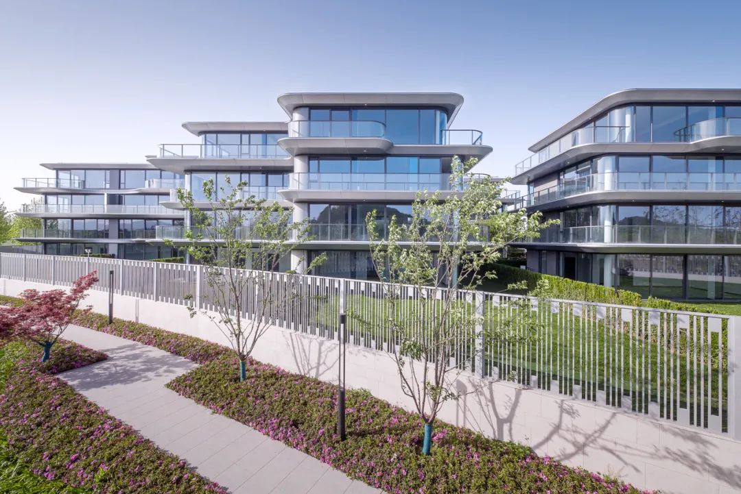 建筑立面采用连续的白色铝板勾勒体块轮廓,贯穿不同组团与楼栋,形成统一而流畅的界面语言。铝板的延展性与纯净感不仅强化了建筑的线性节奏,也在视觉上织就出整体性的住区风貌,使整个社区在多样化产品形态中依然保持高度一致的设计气质与识别度。
