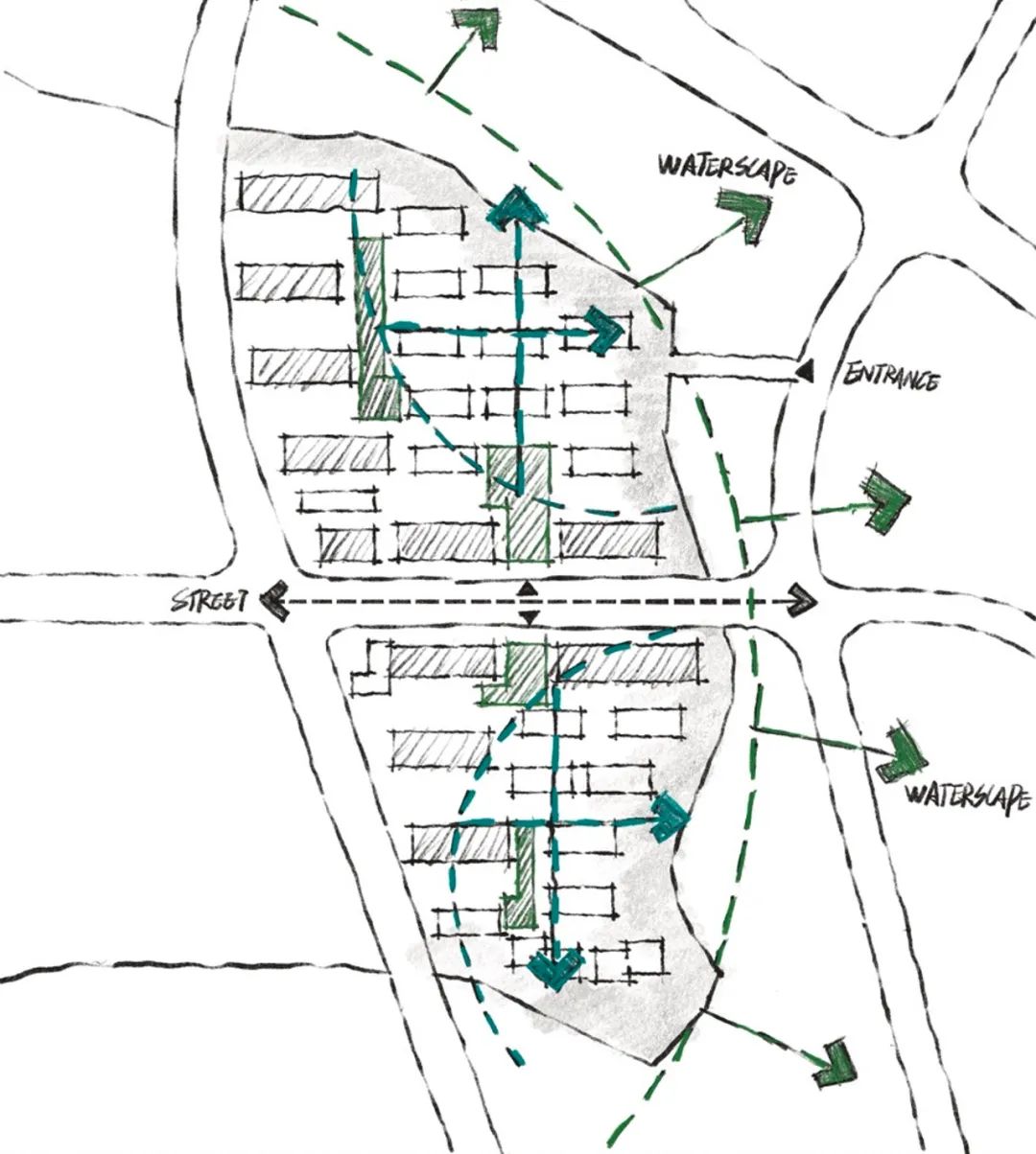 The master plan centers on maximizing the site's natural resources. Four-story low-density residences are arranged along the waterfront in a staggered layout, forming a series of riverside clusters. Surrounding these are seven- to eight-story buildings organized in L-shaped bands along the urban roads. Together, the two typologies create a layered spatial composition that shares and amplifies the value of the waterfront views.