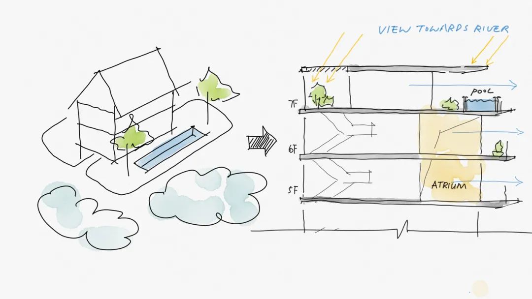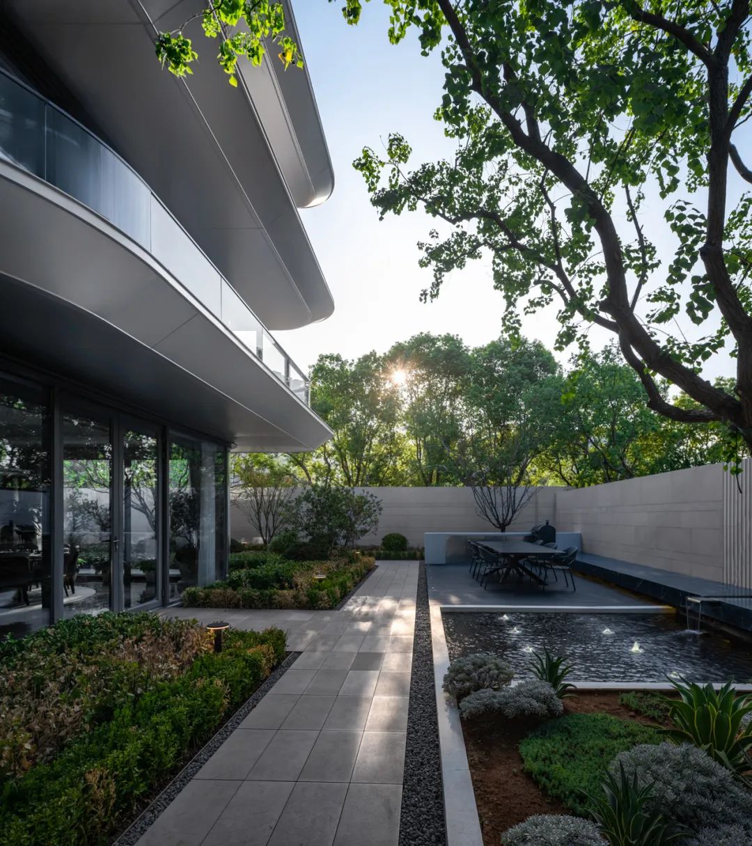 The surrounding river, embraced on three sides, is artfully drawn into the community, transforming into meandering water lanes and gentle streams. Through a soft and seamless approach, the design integrates the external natural water system with the internal living environment. Water and greenery weave through every layer—from the central landscape axis to the cluster gardens, from courtyard spaces between buildings to shared green areas—creating a rhythmic progression of dynamic and tranquil spaces that culminate in a rich, multidimensional landscape experience.