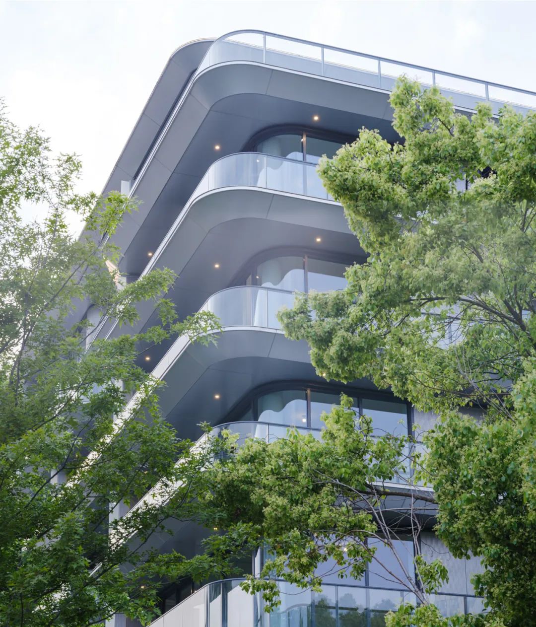 建筑立面延续了“烟波飞鹭”广受好评的轻盈通透设计风格,以全落地玻璃搭配简约银白铝板作为主基调,营造出现代、纯净的建筑气质。每一层均配备宽敞的贯通阳台,实现室内与室外空间的无界过渡。相较于传统住宅厚重的实体墙体,这种开放而通透的设计策略有效打破了城市中人与自然之间的隔阂,营造出更亲近自然的生活体验。