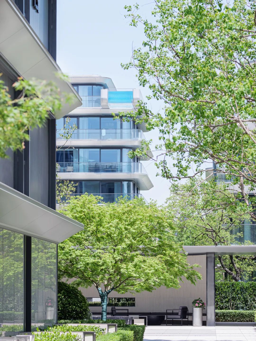The building facade features continuous white aluminum panels that outline the architectural volumes and extend seamlessly across different clusters and buildings, creating a unified and fluid visual language. The aluminum's smoothness and purity enhance the linear rhythm of the architecture while visually stitching together a cohesive residential identity. This approach ensures that, despite the diversity of product types within the community, the overall development maintains a strong sense of design consistency and recognizable character.