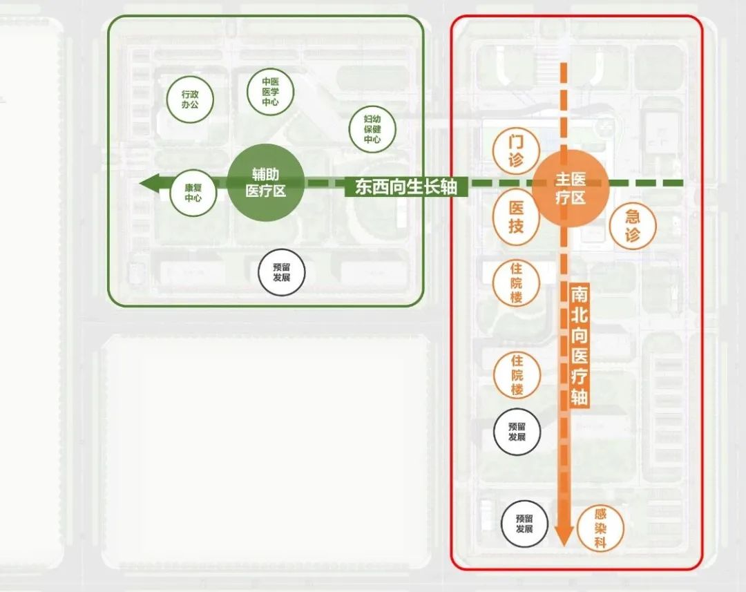 东侧地块为主医疗区,南北向的医疗街纵向贯穿急诊与门诊、医技,构成南北发展主轴。依托东区门诊医技,西侧形成以行政科研、妇幼保健及残疾人康复为主的次医疗功能区,联动构筑东西发展次轴。西侧地块则聚焦妇幼保健与残疾人康复核心功能,远期可拓展月子中心、老年康复护理及介护介助等康养产业。