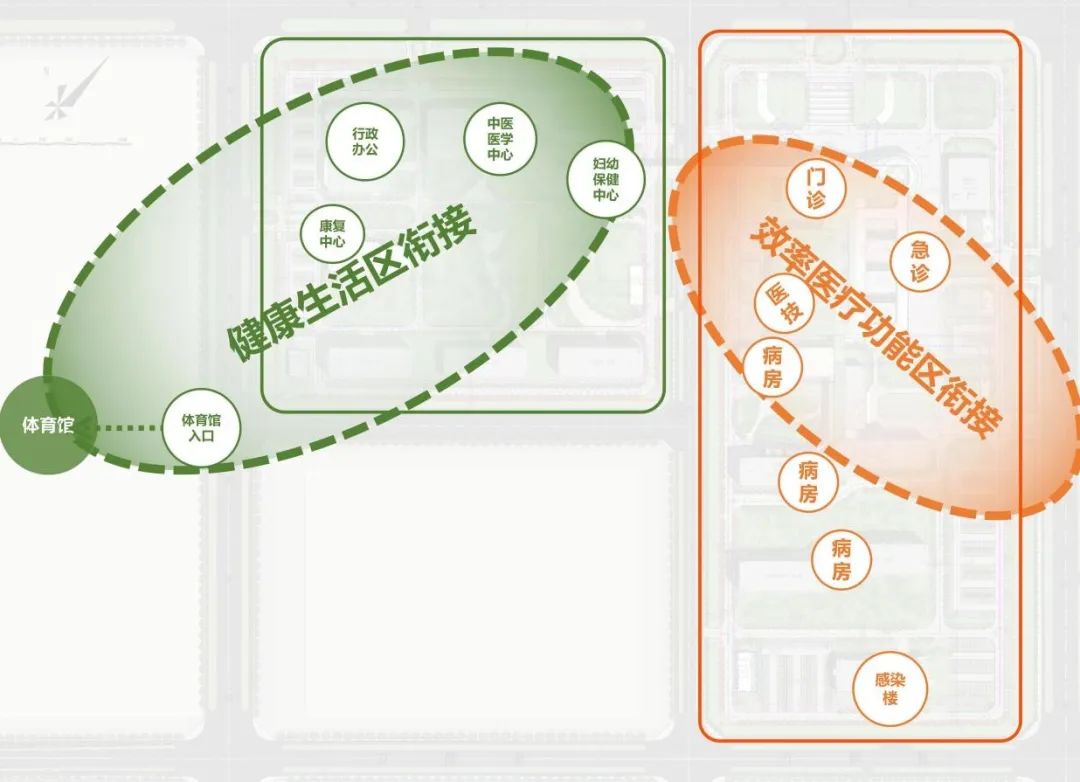 主医疗区东侧毗邻药检所、血站等城市配套功能,便于与手术区及门急诊建立便捷联系。西侧的次医疗区域人流相对较少,特于南北向分设独立出入口,有效分流西侧体育馆的密集人流。