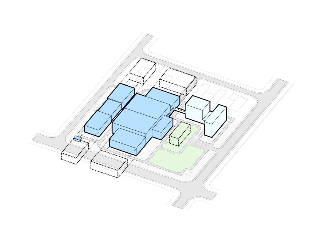 总体布局上,非机房区运营管控楼及综合楼采用北板南点两栋高层以裙房连接形式,L型布局于南北轴线西侧,在尽可能争取南向采光、避免对视的同时,与南侧机房楼围合形成大面完整室外空间,为有人区提供内向型集中景观绿地及机房楼超大体量形象展示面。