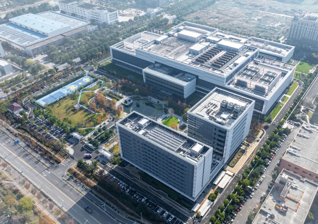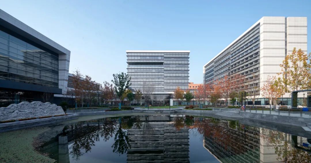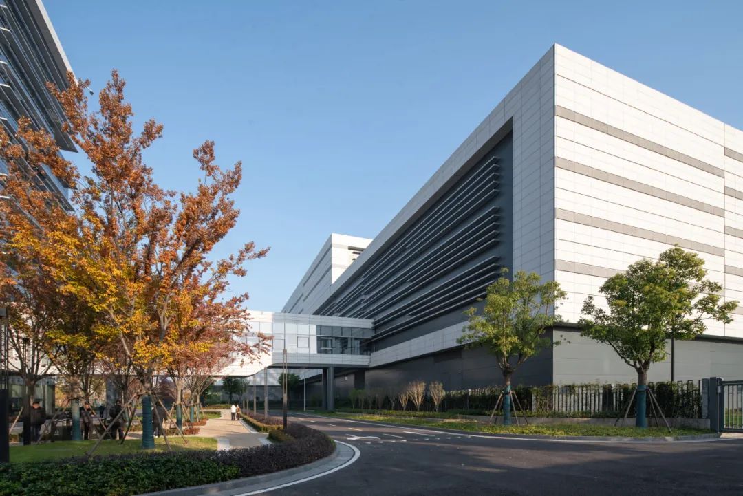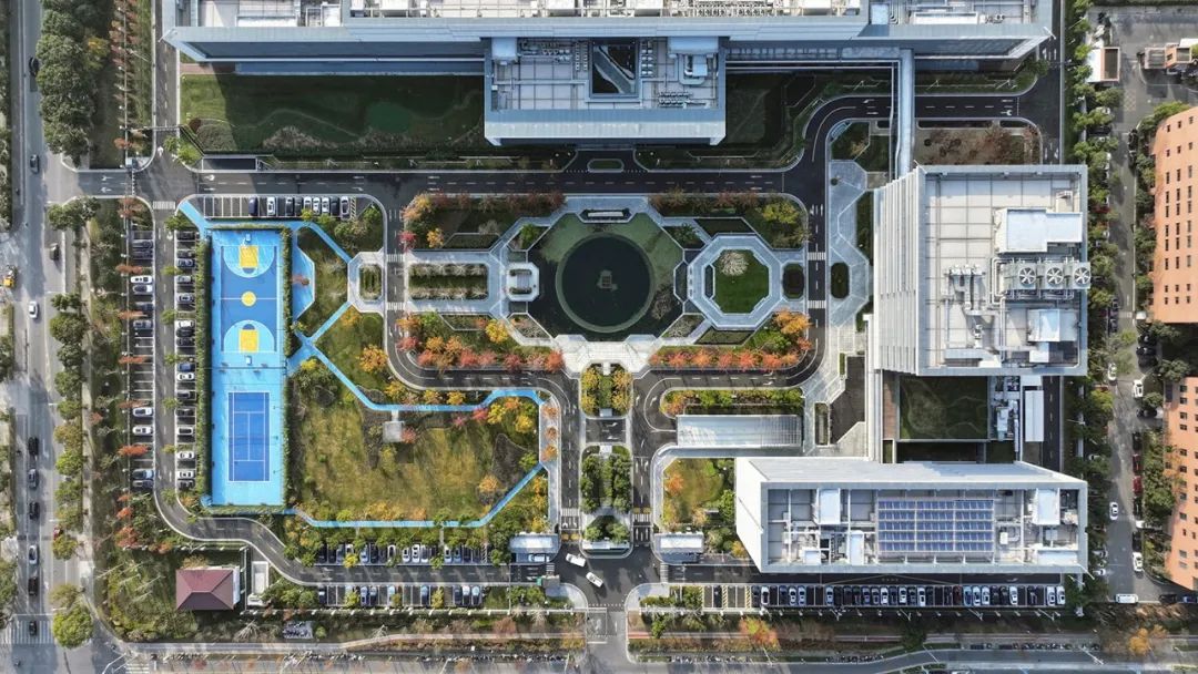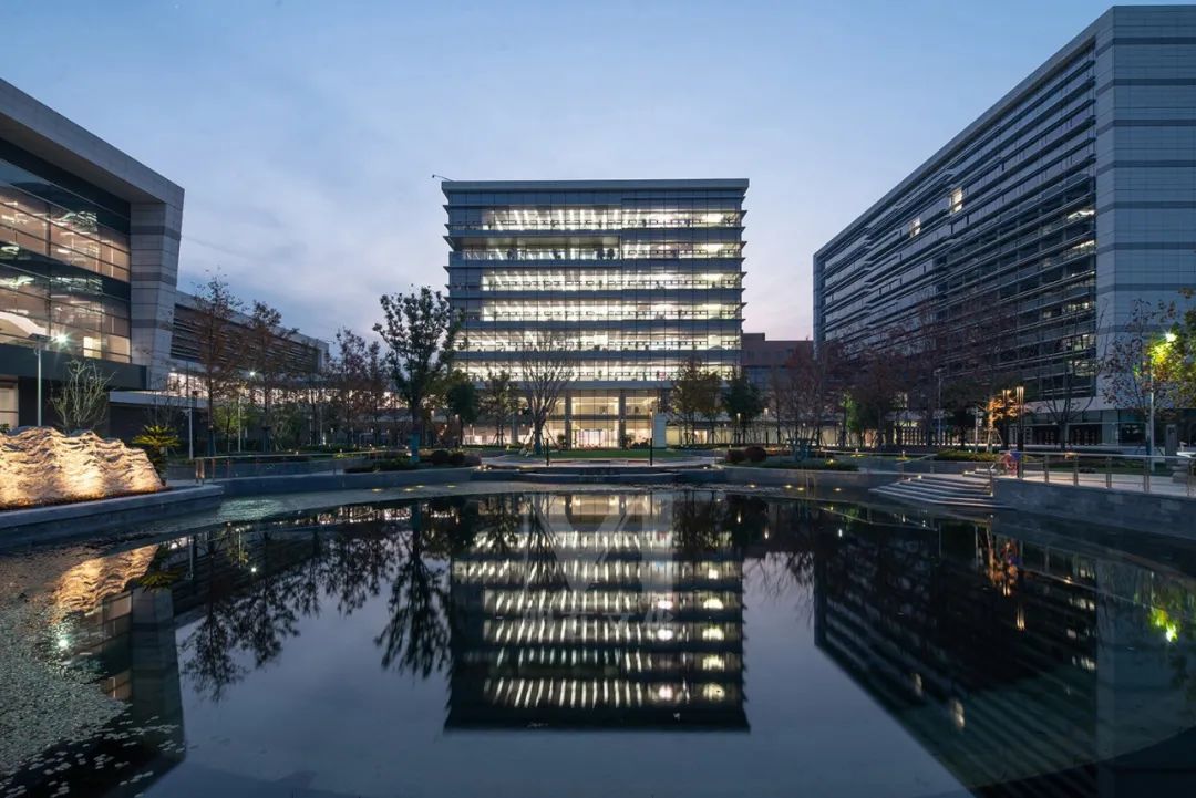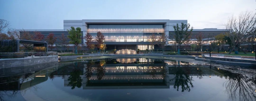 室外景观上,与建筑主题相呼应,亦从集成电路中抽取构成元素,以正对运营管控楼及ECC的集中景观水池为核心,分别形成北侧园区主入口—造型照壁—林荫道—景观休息廊—滨水台—集中景观水池—ECC前景石层层递进的仪式感序列空间,以及四角喷泉—峡溪—跌水—集中景观水池蜿蜒迂回后汇聚一处的灵动流线,结合健身设施及景观小品,以及四季皆有景的绿植布置,营造富于江南园林意蕴的高科技园区,为园内人员在日常工作之余提供亲近自然,可观可游的一方休憩之所。