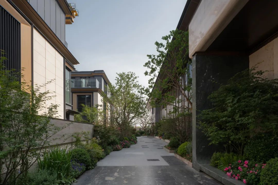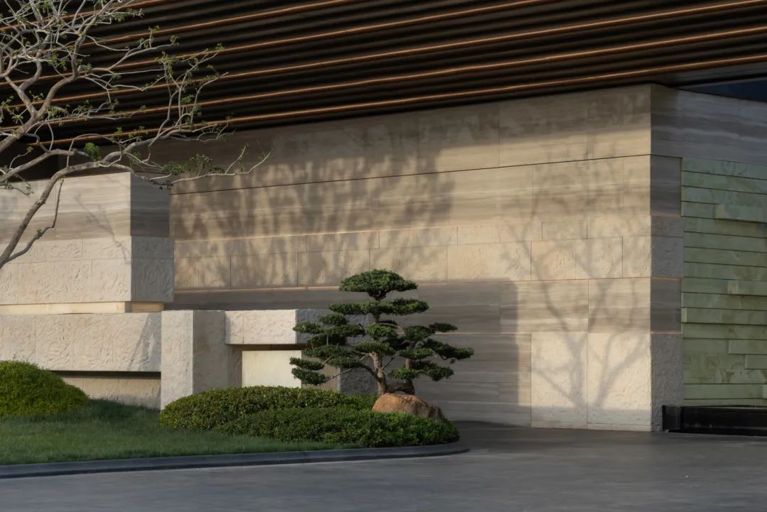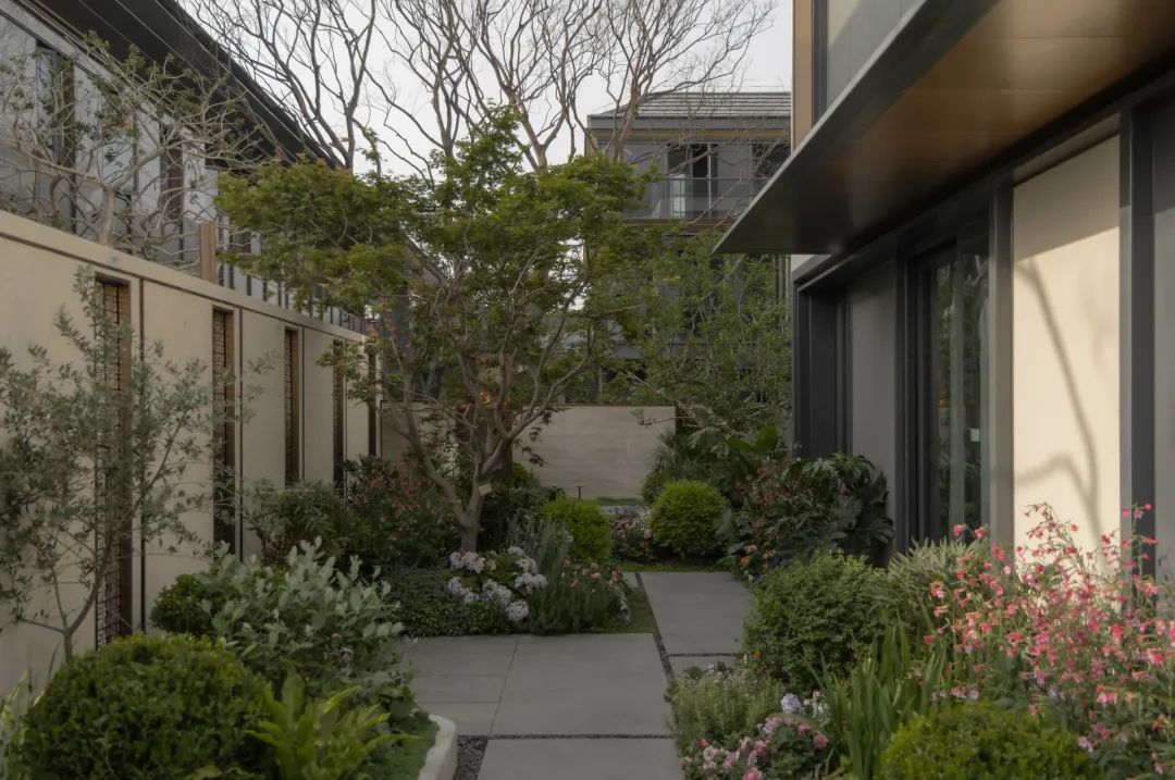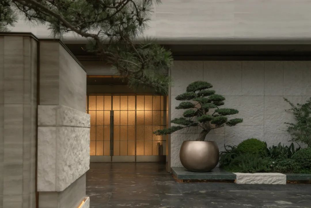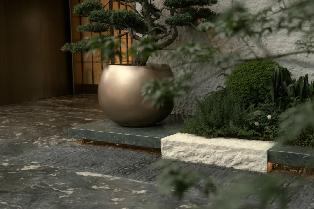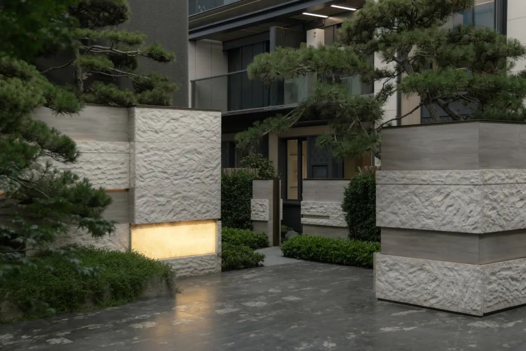 抵达归家必经的玄关花园,五棵身姿挺拔的松树似镇园之宝般傲然伫立,成为归家花园的主景核心