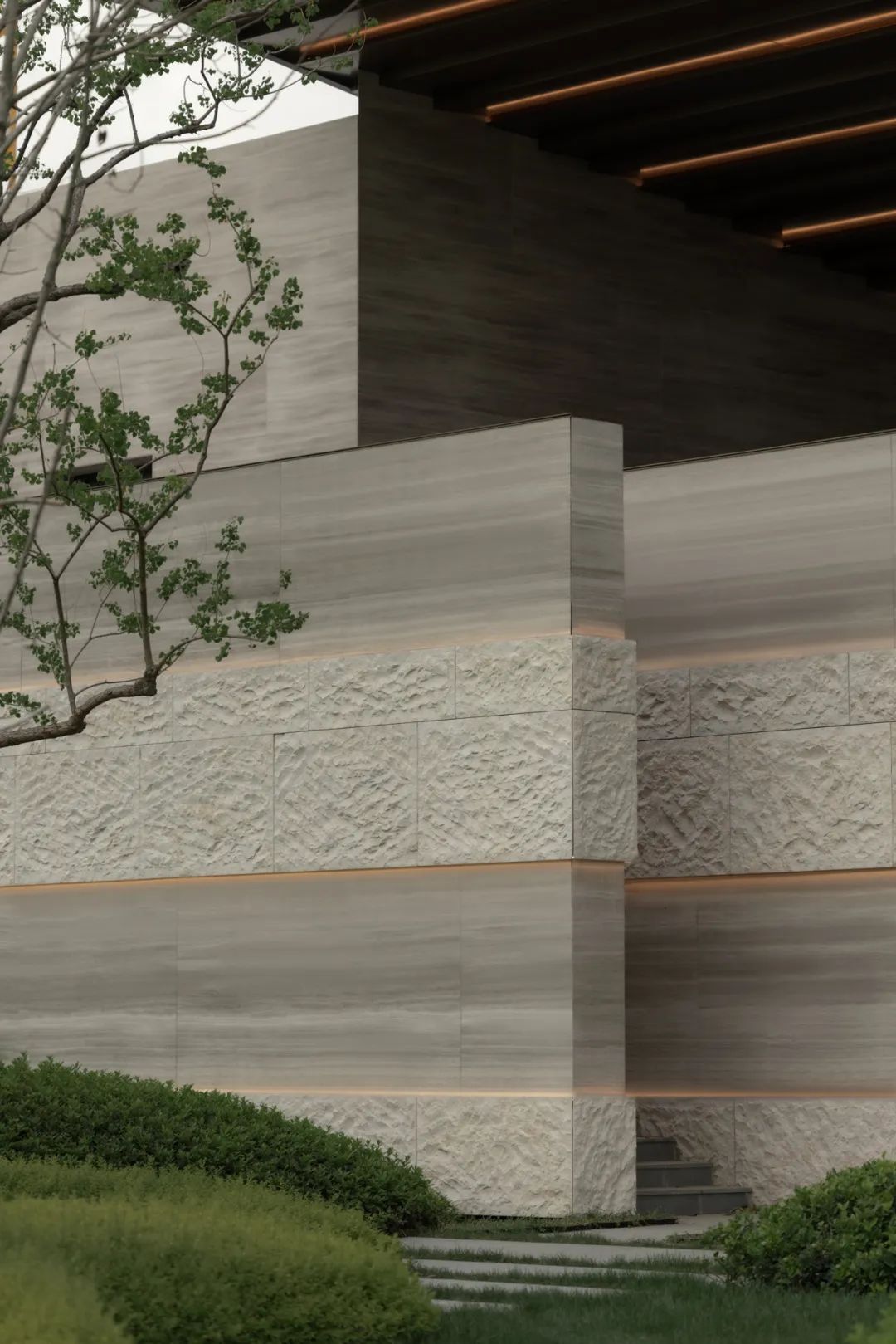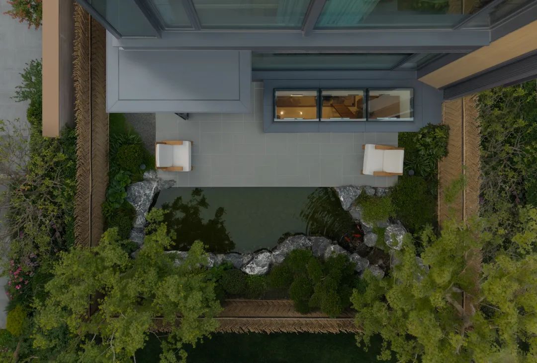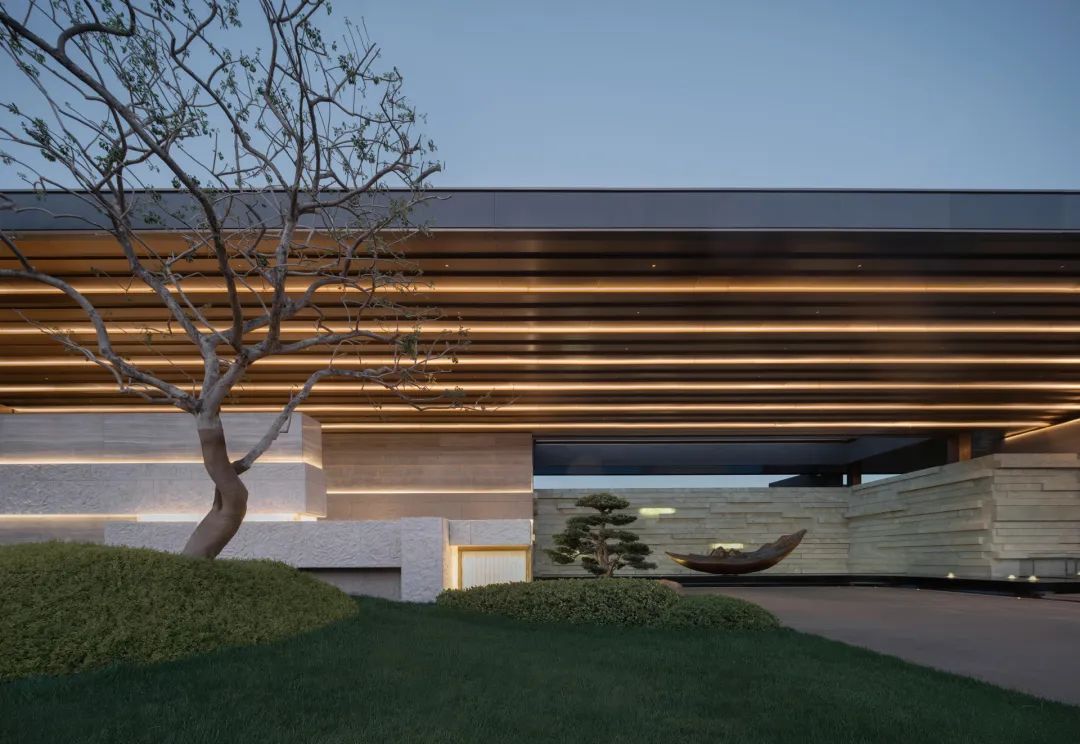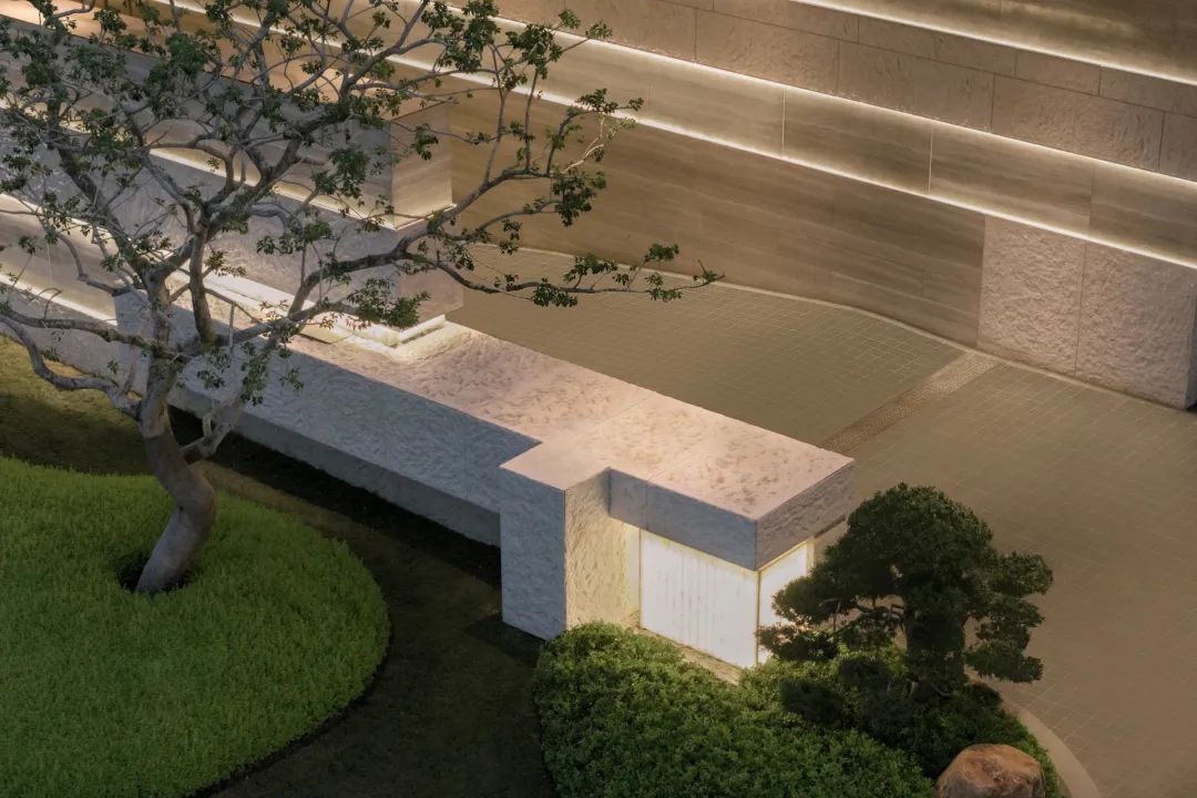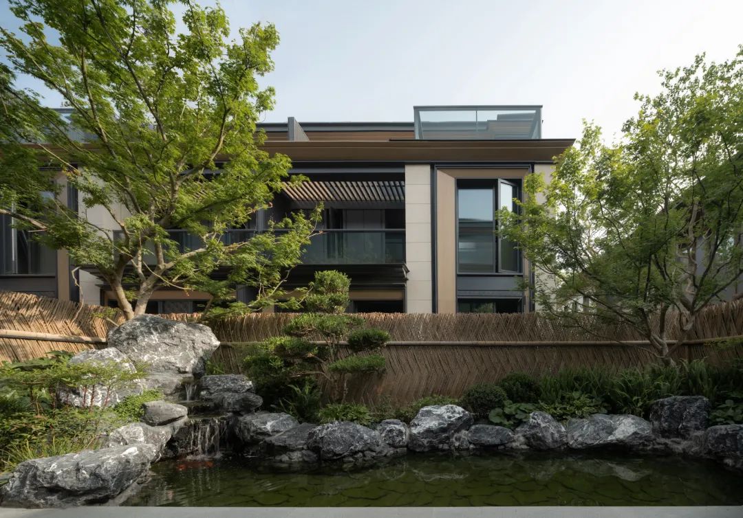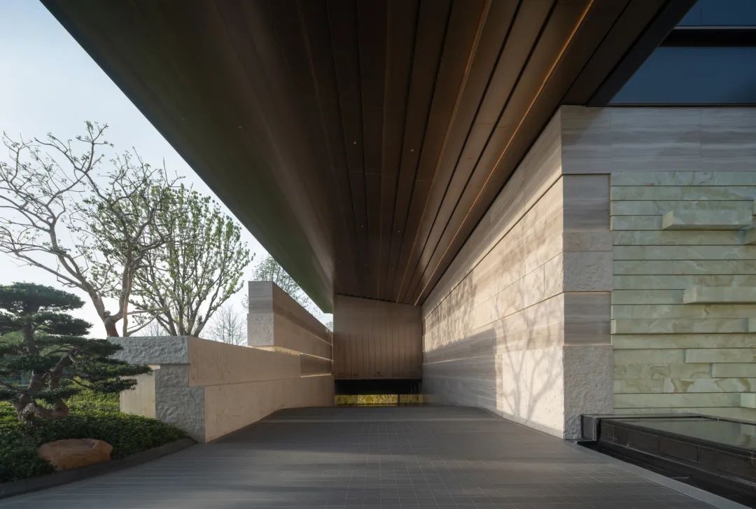 抵达归家必经的玄关花园,五棵身姿挺拔的松树似镇园之宝般傲然伫立,成为归家花园的主景核心