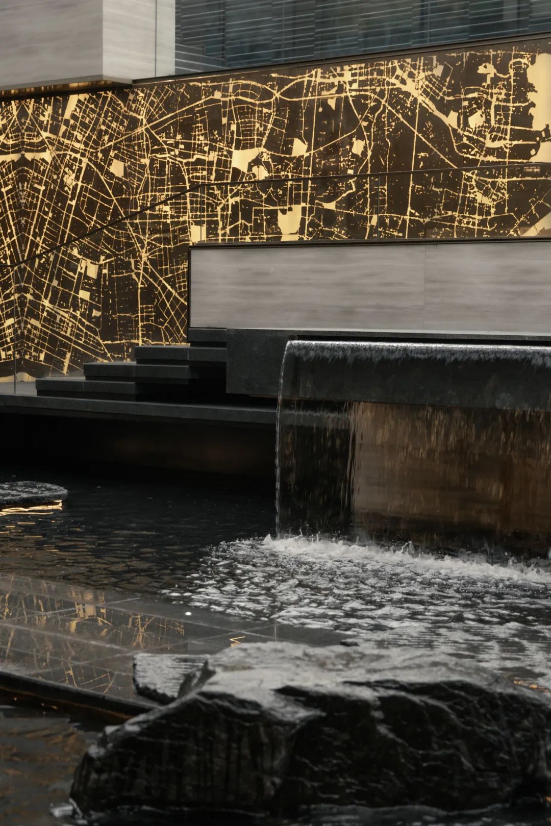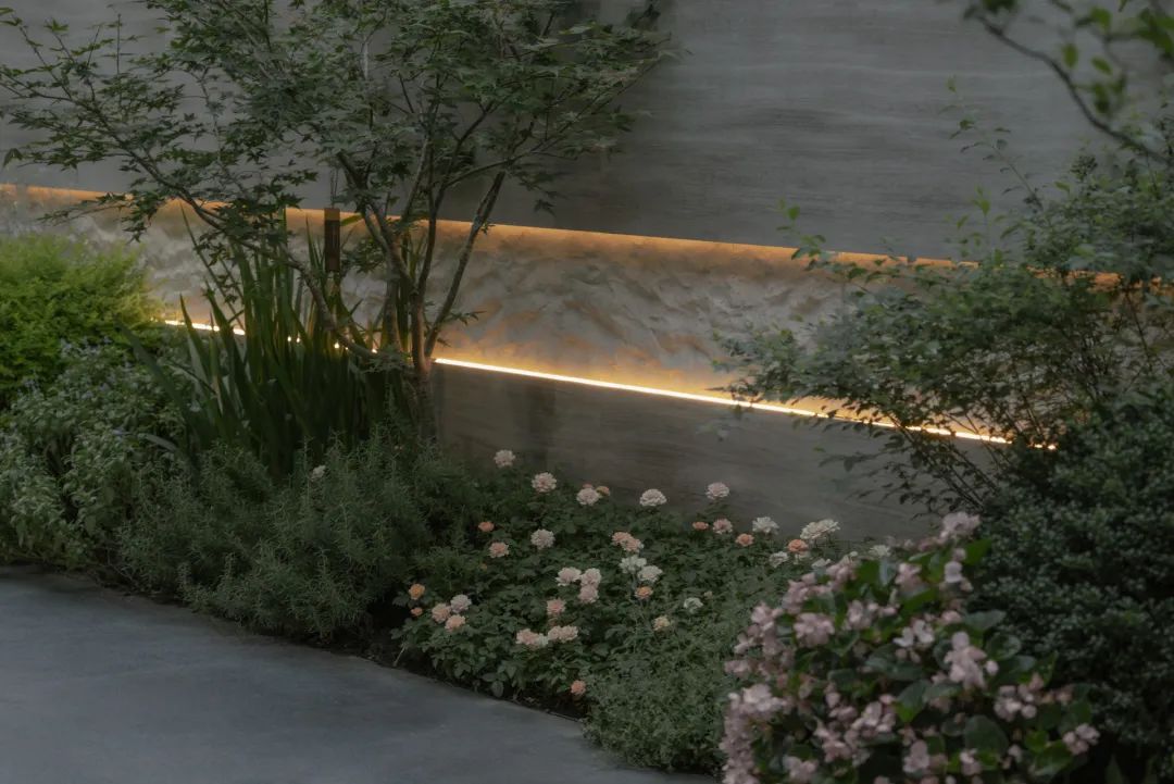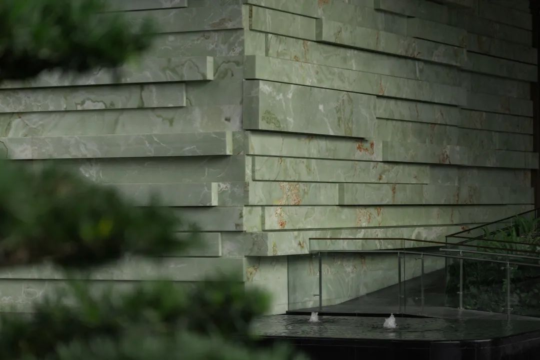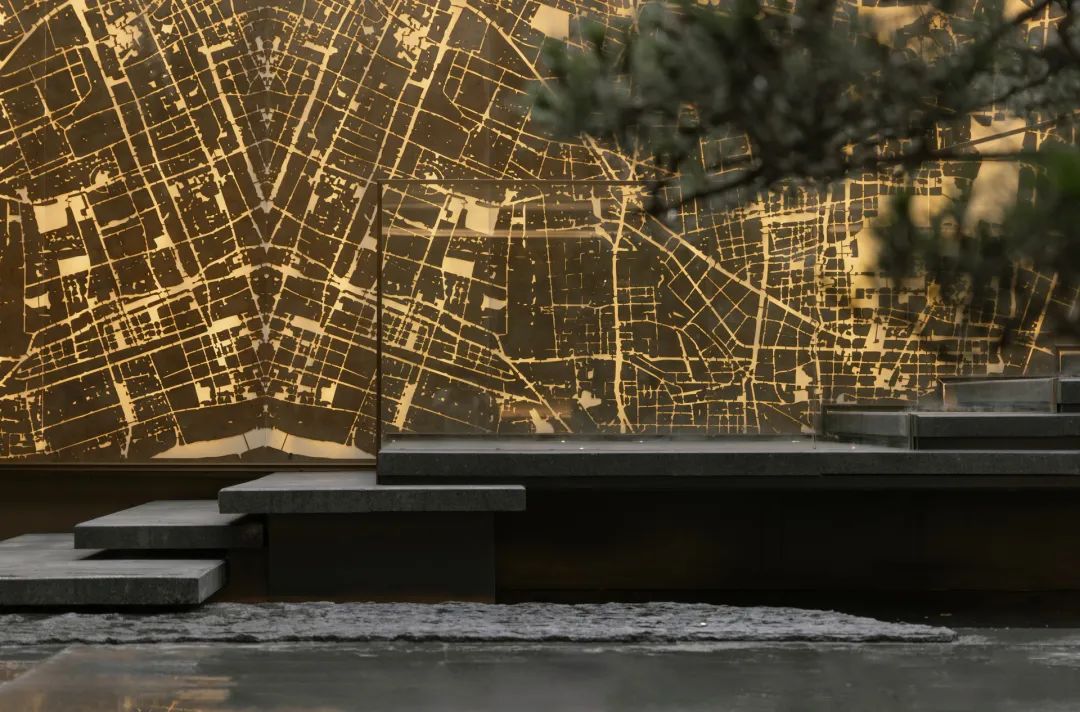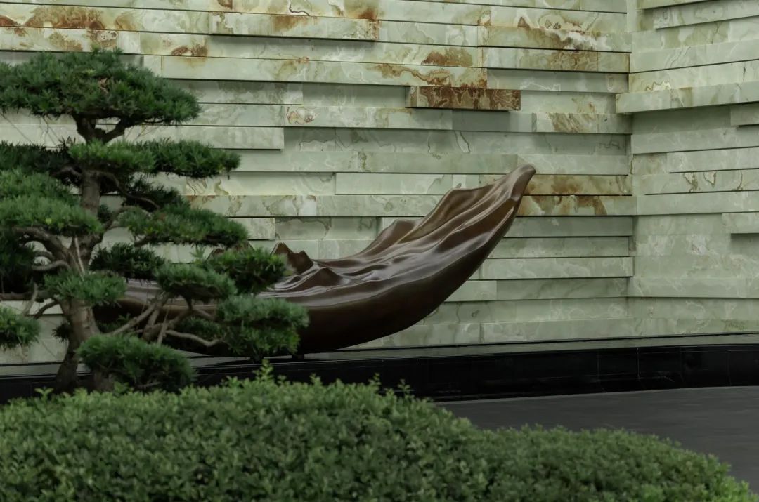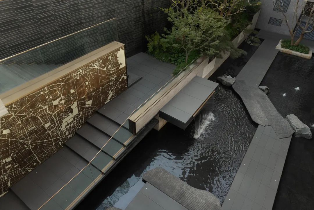 循着潺潺流水声,脚步不由自主地被牵引着。行至下沉空间,眼前景象,仿若 “一折山水一折诗”的古老意境。从那缥缈的诗句中,唤出于眼前的这幅流动的诗意画屏。