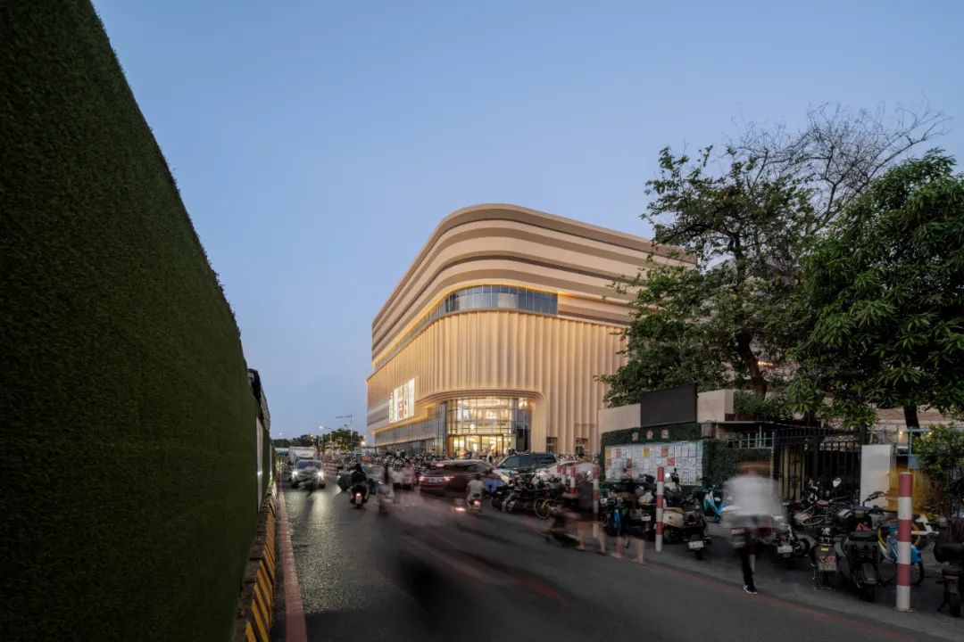 PHA以“山水叙事”为内核,将白云湖的波光与岸线演化为新一轮的空间表达。立面结合岭南传统舞龙与灯笼的文化元素,利用波纹铝板、拼色铝带形成连贯一致的立面形态。主立面的超宽折面玻璃幕墙,不仅突出了主入口的显著性,更营造出白云湖村时隐时现的视觉效果,带来全新的购物感受。