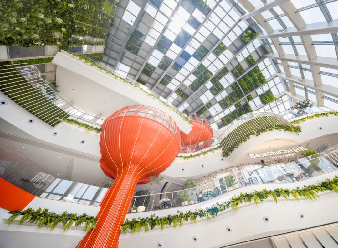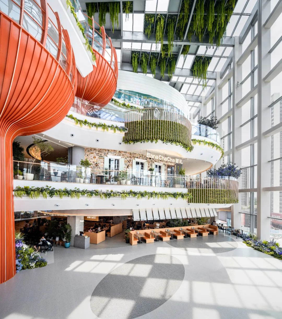 精心打造的“空中城市客厅”以开阔的空间及独特的设计成为人气聚集地。“山行水意”旋转楼梯以创新的拓扑形态解构传统动线,四层通高绿植墙将自然向室内延伸,实现商业引流与自然体验的有机融合,构建出自然放松的休憩、社交场所,并为商场未来多样化运营活动预留出空间。