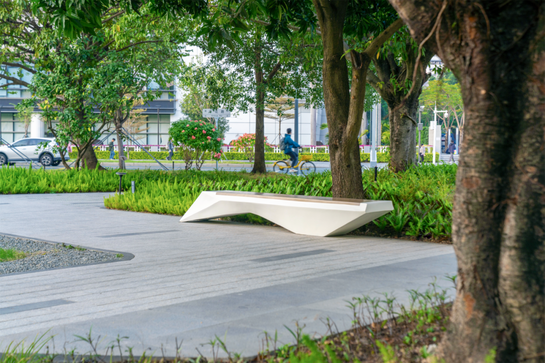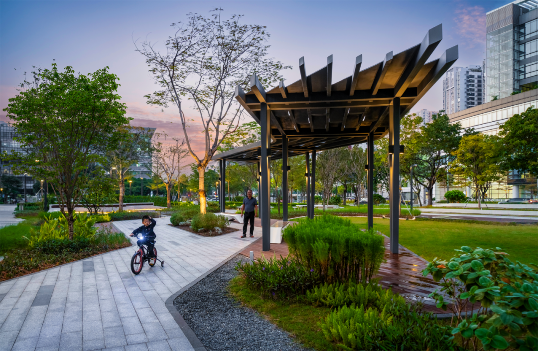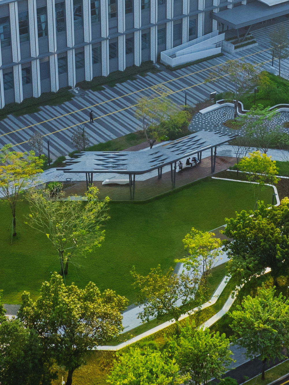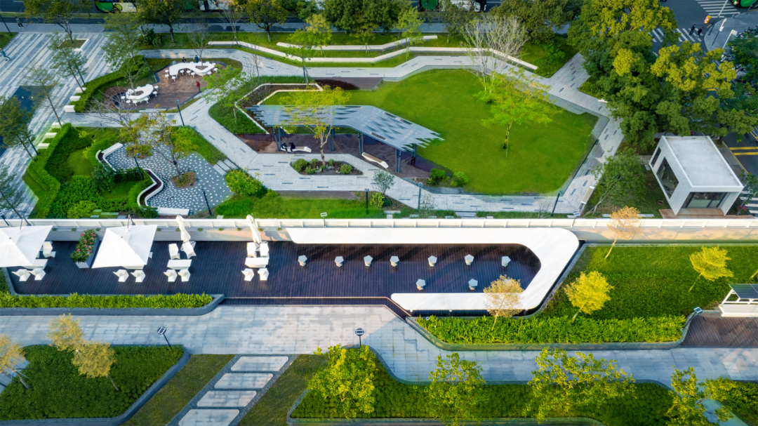 折线网络如灵动的电路轨迹,巧妙串联起功能区:供居民野餐休憩的绿茵草坪剧场;科创工作者户外办公的智慧花园;以及为行人遮阳避雨的景观廊架,交织人文与自然。