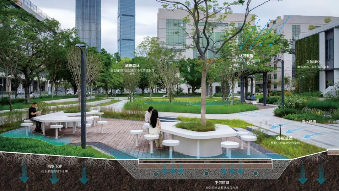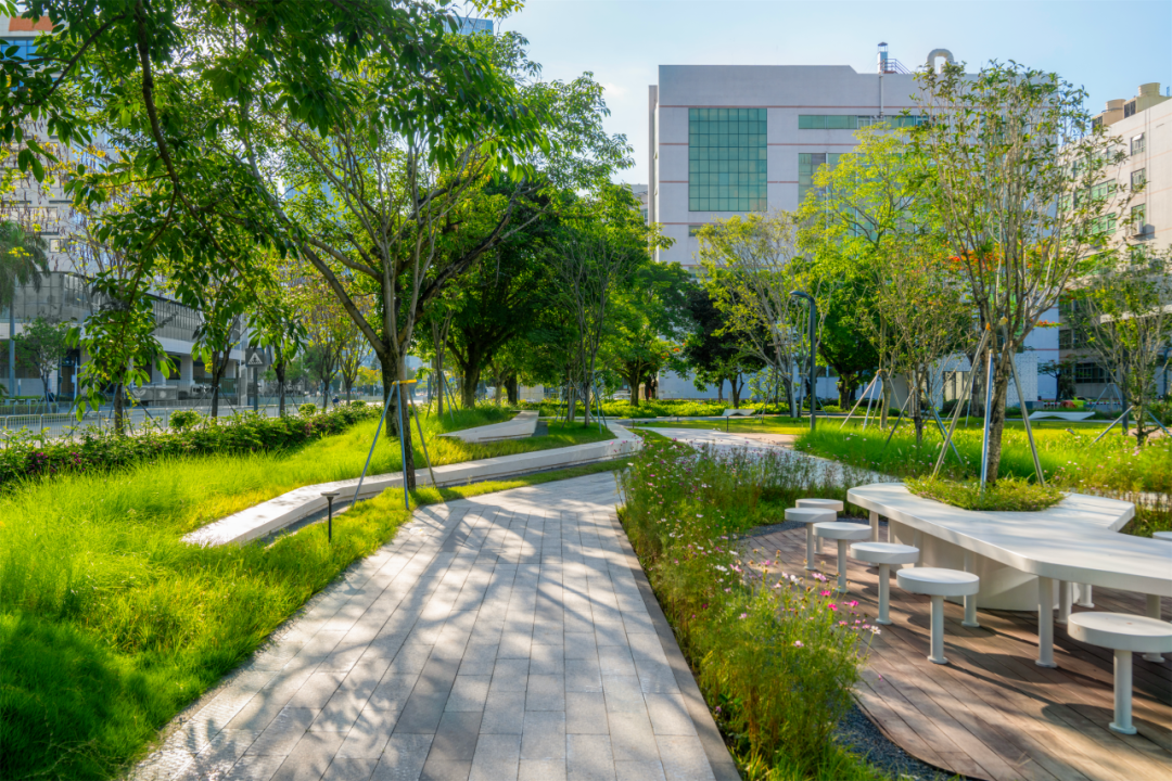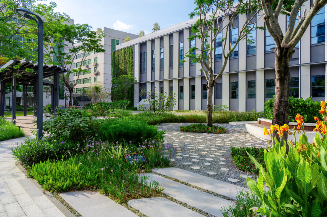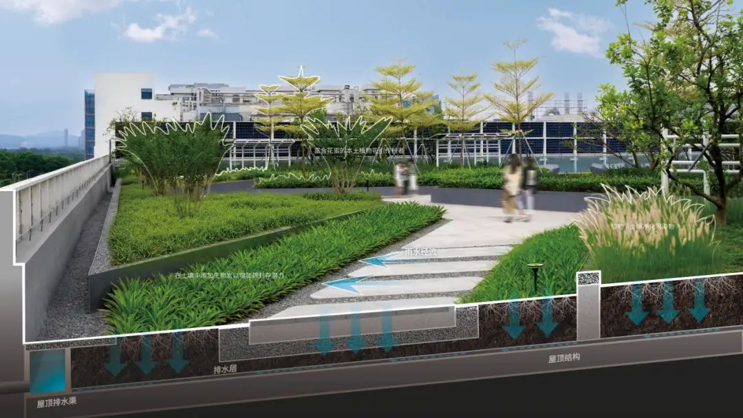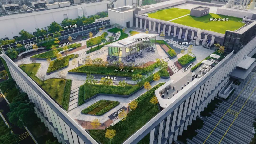 “增汇”策略在土壤修复与高碳汇植被构建上双管齐下。北侧珍贵的原生荔枝林被完整保留,成为承载过去与未来与强大固碳功能的生态文脉。景观团队更通过精心规划,将LID设施、绿色屋顶、立体绿化与城市森林交织融合,使园区绿化覆盖率提升至60%。 本土高固碳树种的选择与引入,进一步强化了这片绿洲的“吸碳”能力。