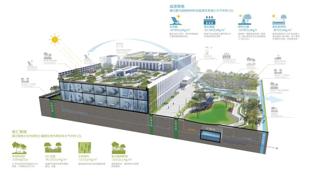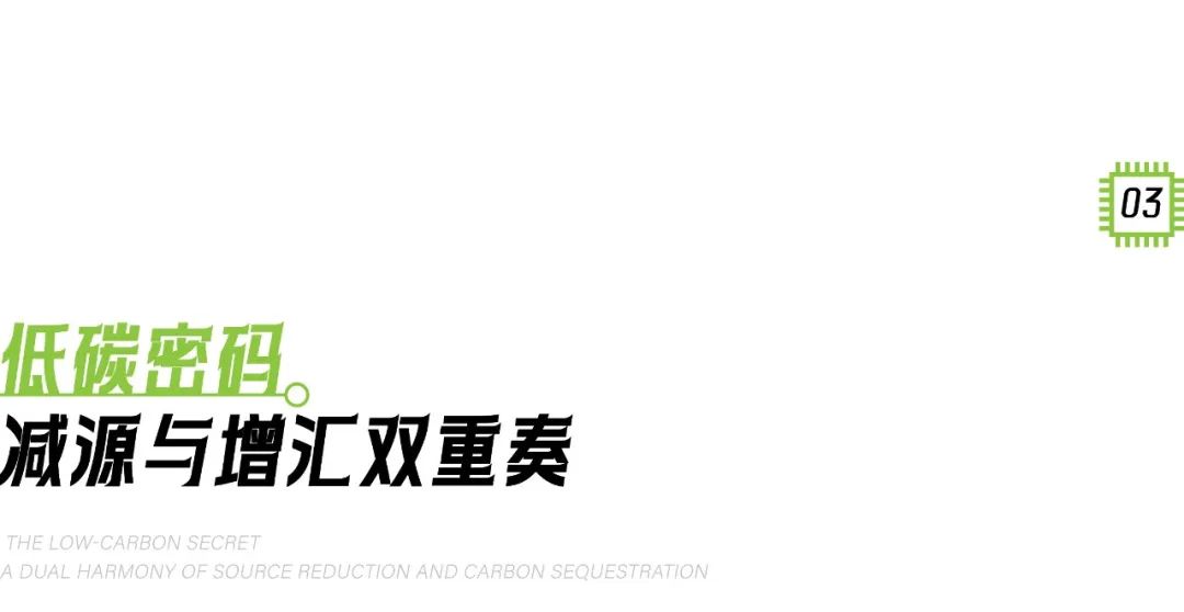 景观团队为 “绿色芯片” 写入的核心程序,“减源” 与 “增汇” 协同运作,并非简单的 “节能 + 种树”,而是一套贯穿周期的逻辑,全面推进近零碳策略。