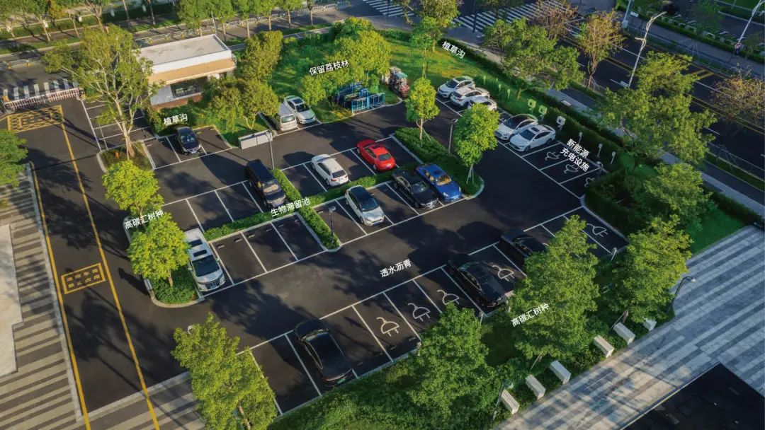 巧妙融入海绵系统,2000 平方米的 LID 设施(植草沟、雨水花园)与 150立方米地下蓄水池,让雨水在这里完成 “收集 — 净化 — 回用” 的历程。