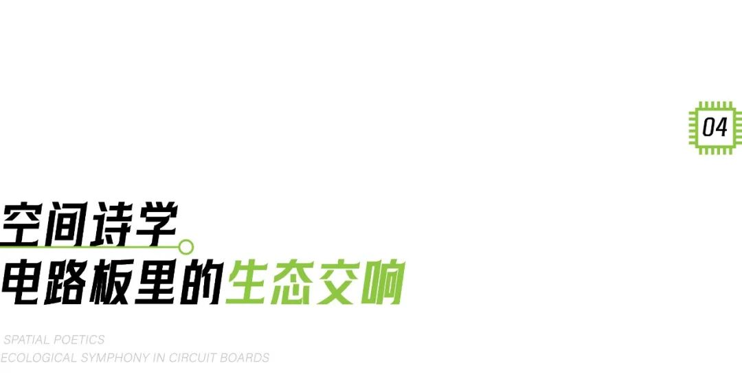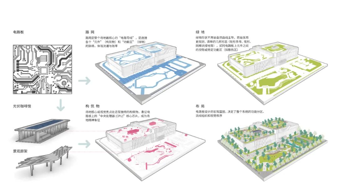 如何让 “科技感” 与 “生态感” 自然融合?生态景观团队以“电路板”为灵感,将导线、电容、电阻等元素抽象演化,注入铺装肌理、路径脉络、景观构筑与功能分区,形成逻辑清晰、紧密互联的景观空间系统。