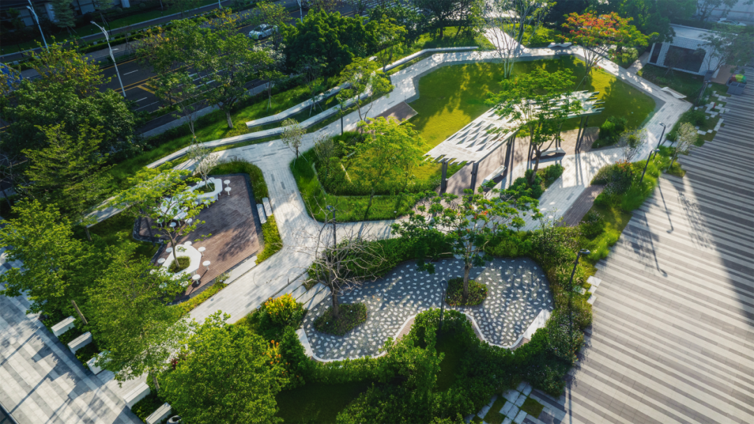 北侧屋顶因视野最佳,被设计成核心观景带,抬头可见蔚蓝天空,低头能俯瞰园区、远处的城市肌理。同时,植物配置与铺装图案特意强化了 “俯视效果”,远看如一幅层次分明的生态画卷。