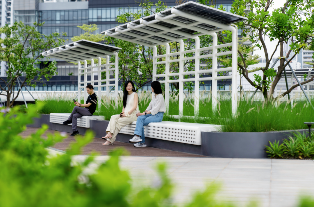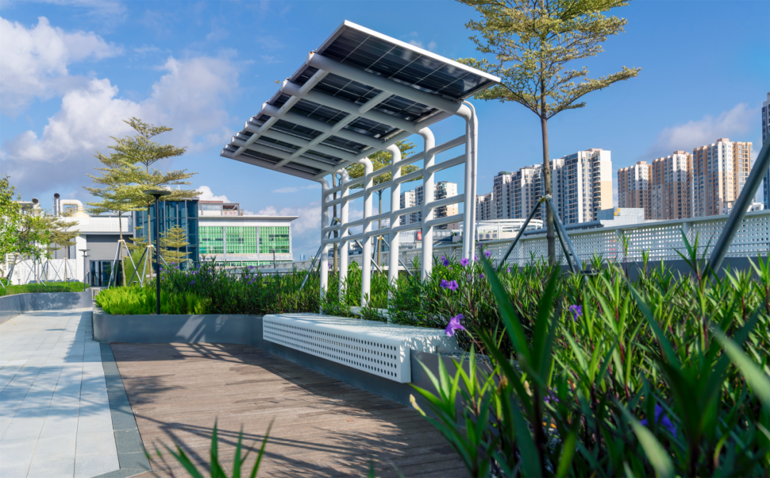 在“减源”方面,景观团队将约300㎡的太阳能电池板集成到屋顶女儿墙、景观廊架和灯具中,年均发电量可达18,000千瓦时,等效减少碳排放25,659KgCO2e(相当于营造一片千棵林木的固碳林);其次将场地内拆除的混凝土废料用于地基填充与透水铺装材料,以取代混凝土的使用;除此之外,景观团队还应用了多项先进的节能技术和材料,包括全园滴灌系统覆盖、智能照明、屋面高反射(SRI)材料应用等,通过节约能源减少排放入大气的CO2。