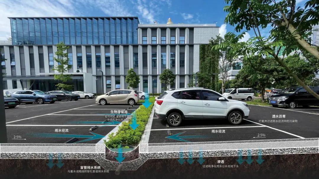 植入海绵系统:打造150立方地下蓄水箱收集后的雨水回用于园区绿化浇灌、道路冲洗和设备冷却循环中水,构建“渗、滞、蓄、用”的雨水管理系统,预计将年径流总量控制率不低于70%、污染物削减率50%。