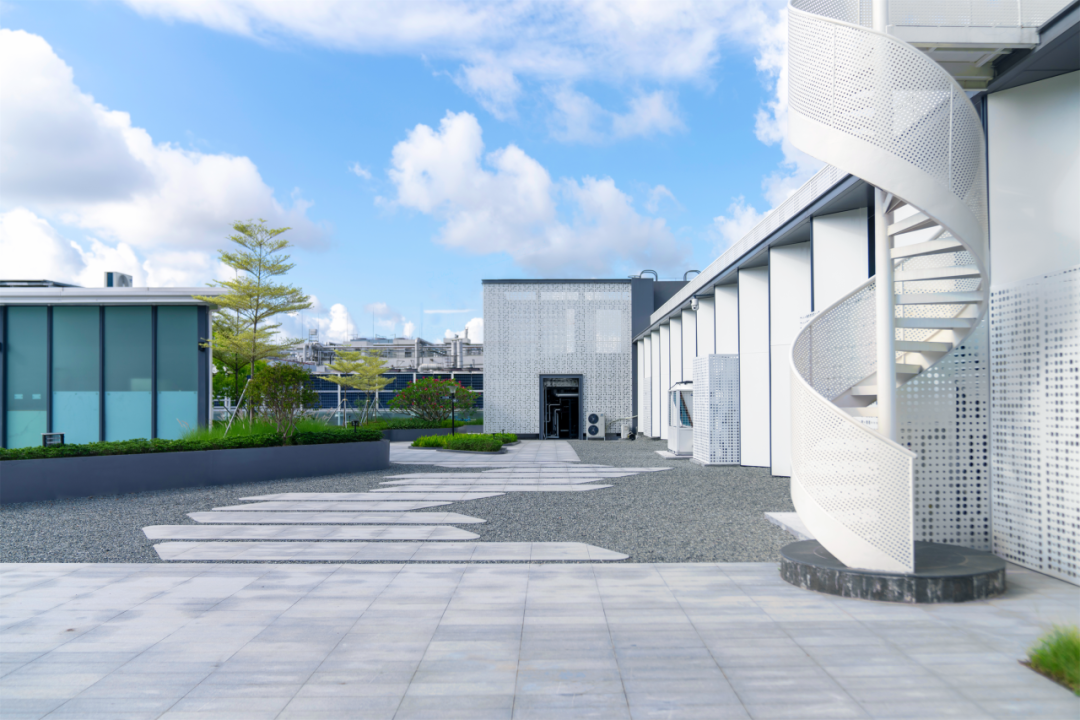 设计却以灵动的折线铺装与错落种植池巧妙衔接,化生硬为韵律。平整屋面由此衍生出观景台、洽谈区、休憩空间;绿意环抱的半围合庭院,更可同时容纳250人共聚,无论是庆典派对、团队协作或科研交流皆宜。