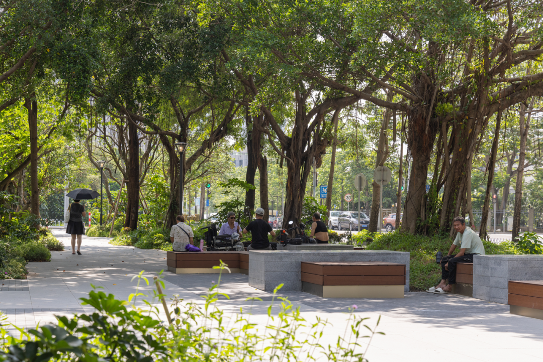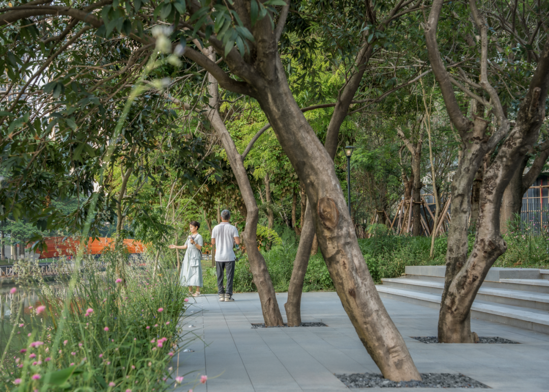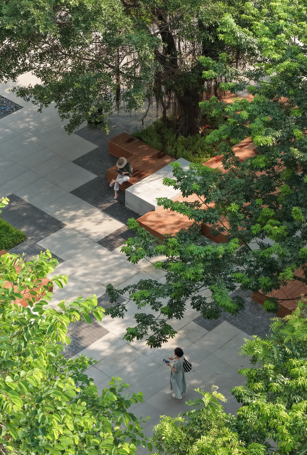 设计保留了场地内的大乔木,以重构休憩树池来激活林下空间,为周边原住民创造全时段舒适的驻留环境,吸引市民自发形成晨练、曲艺、市集等多元广府特色的生活场景,将生态保护转化为承载地缘性场所记忆的活力容器,实现自然生态与城市烟火的共生叙事。