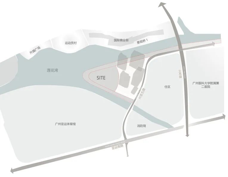 亚运公园择址广州番禺区亚运城综合发展区的核心岛尖地带,三面环湖,享有无可匹敌的270度开阔湖景视野。西南侧紧邻片区地标亚运城综合体育馆,与成熟的城市肌理紧密共生。