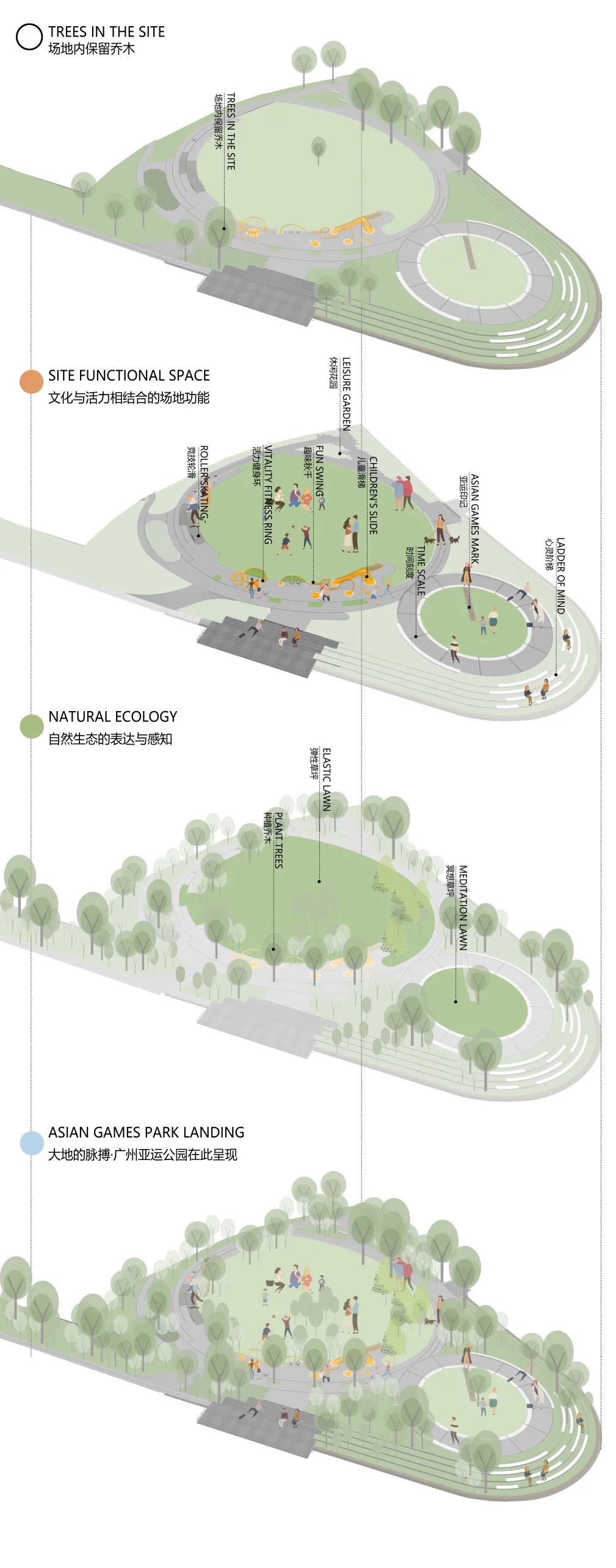 以全龄需求为导向,系统植入功能互补的复合活动场景。依托自然基底有机串联,构建活力渗透的滨水体系,建立与人之间的价值认同和情感共鸣,延续亚运精神,激活场地内部,打造活力能量流与精神地标。
