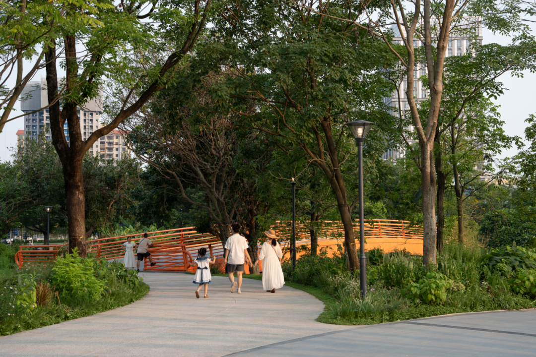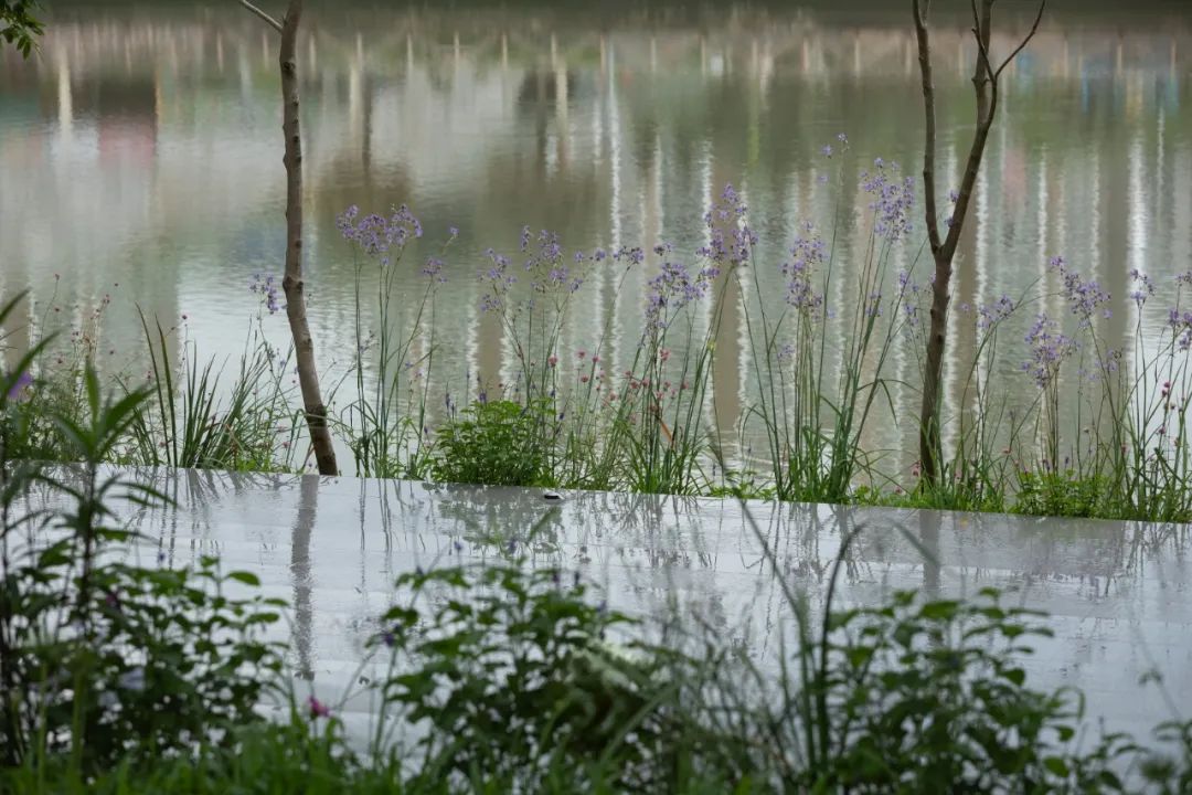 通过放大局部路径创造弹性空间节点,在视野开阔处嵌入亲水平台,极大的增强空间的参与度与观赏性。临水界面设置湿生植物带,软化硬质边界的同时构建水生生物栖息地,实现人-水-绿的多维共生。