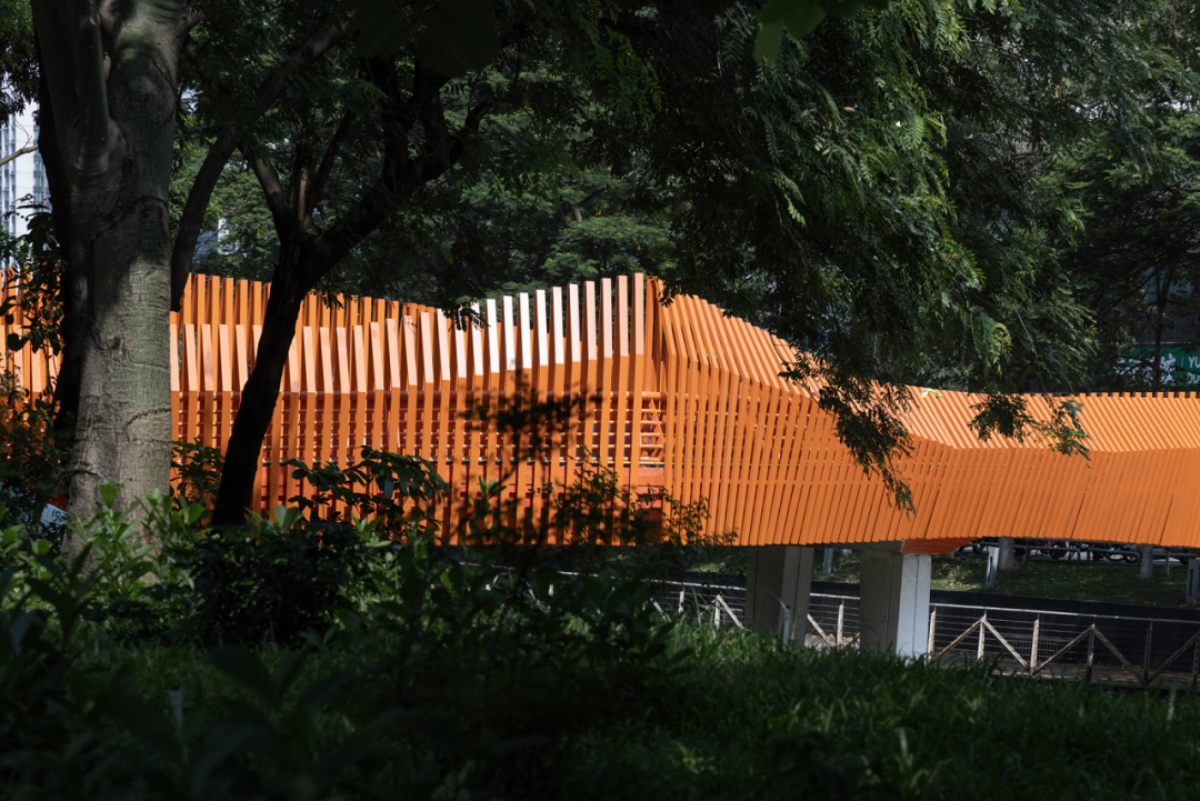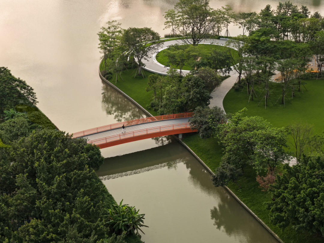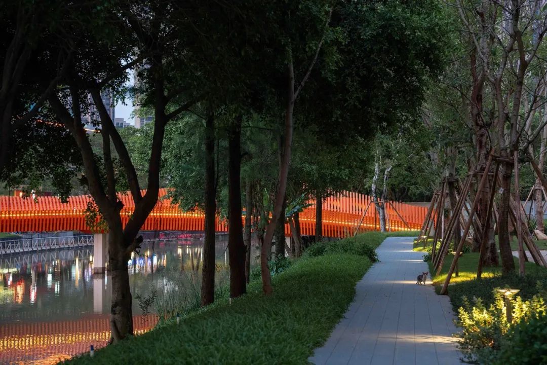 环线串联多元亲水场景,以景观桥贯通三岸。更新后的景观桥灵感来自广州亚运LOGO“跃动脉搏”的律动线条,采用波浪镂空肌理强化水岸语境同时呼应体育精神张力,辅以本土乔木与休憩设施,构建一条绿色慢行生活环,让市民在自然野趣中尽享全时段滨水活力。