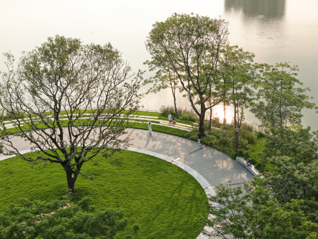 冥想草坪中央孤植舒展的点景乔木,成为空间的视觉焦点,无界衔接开阔湖面,形成递进的景深层次,使静坐者视线自然滑向水天交界,保证全景式观湖视野。风声、鸟鸣、水波等自然声景,构筑剥离城市喧嚣的感官沉浸场,为市民提供心灵疗愈的静思空间。