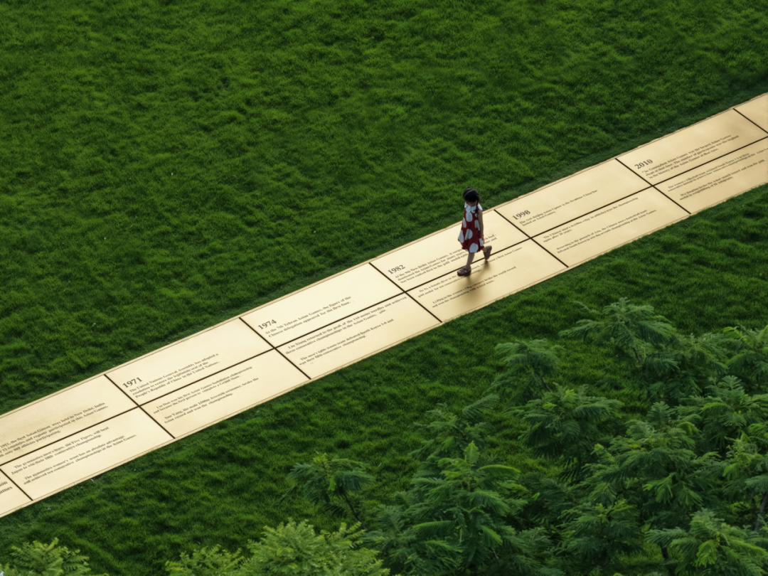 挖掘亚运精神,从亚运“时间的齿轮”核心意象中提炼空间语汇,将象征向阳而生、永恒探索的环形构图转译为场地中的形式逻辑与精神载体。以金属锻造刻度镌刻历届亚运会举办时间与城市,指针上刻印着亚运史及广州亚运会杰出运动健儿的夺冠瞬间。塑造兼具自然野趣与时代气息的标识性滨水地景,使之成为承载集体记忆的城市新名片。