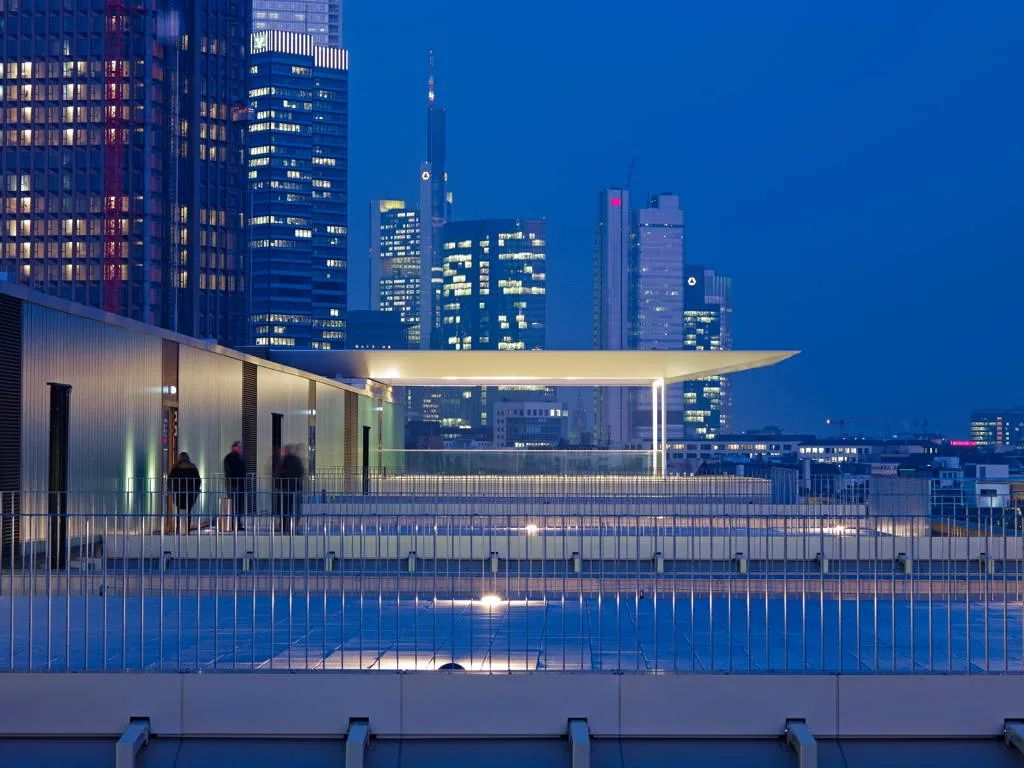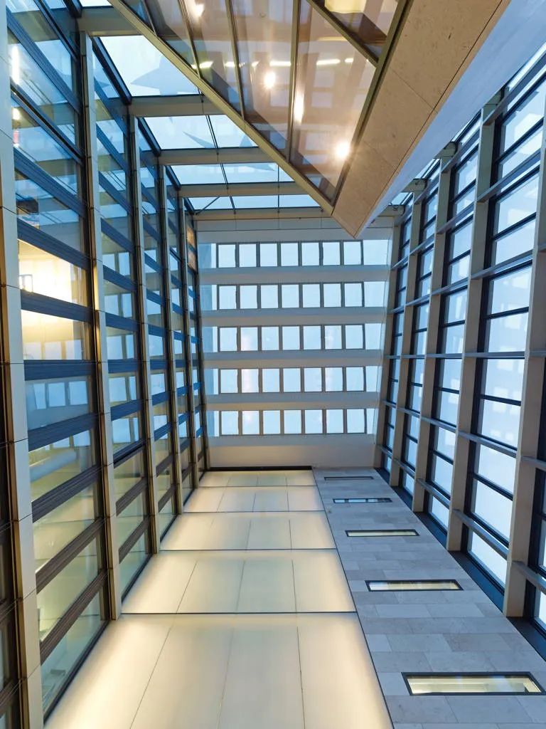 Staff and visitors enter the building through a multi-storey entrance hall in the east. This hall leads to the reception area, lobby and to the elevators leading up to the office floors. Independently accessed restaurants and commercial units are located along the Europa Allee, and are serviced from the north. The upper floors house offices of various sizes (used by the bank and other tenants), separated by multi-storey green courtyards to the south. The roof areas facing the Europa Allee are kept free of technical services, and include smoking areas utside all access cores. In the space over the conference area on the first projecting element, a smart roof terrace has been created with an elevated retractable glass roof.