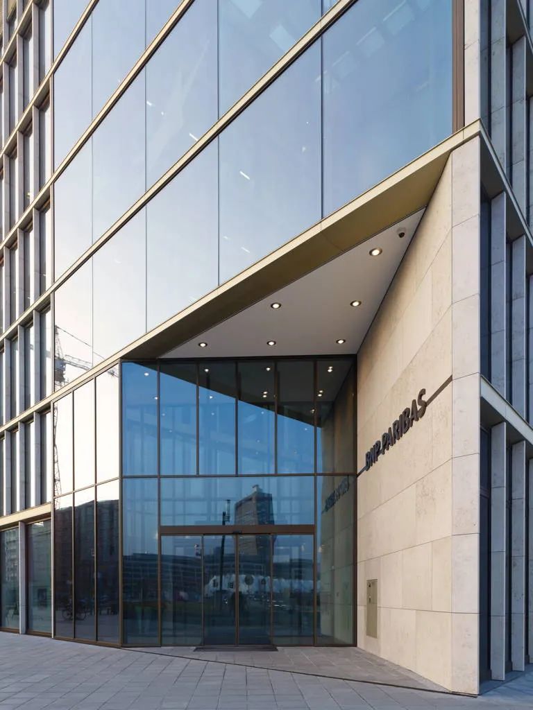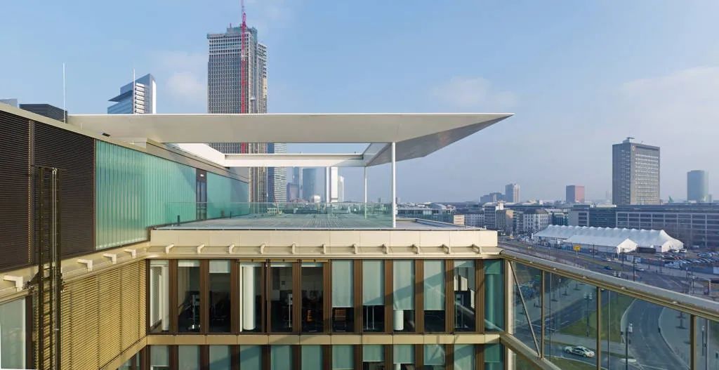 工作人员和访客通过东边的多层挑高大堂进入建筑,同时设置独立的餐厅和商业入口。上层设有不同尺度的办公室供银行和其他租户使用,南面由多层绿色庭院隔开。建筑端部临近入口的顶部空间,一个带有高架可伸缩玻璃屋顶的智能屋顶露台成为建筑的雕塑性形象。该建筑也作为可持续建筑典范获得 DGNB 银奖!