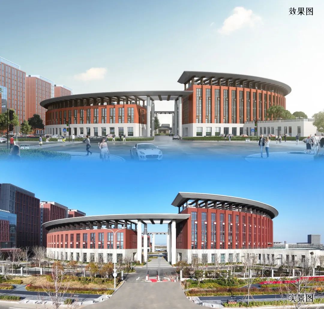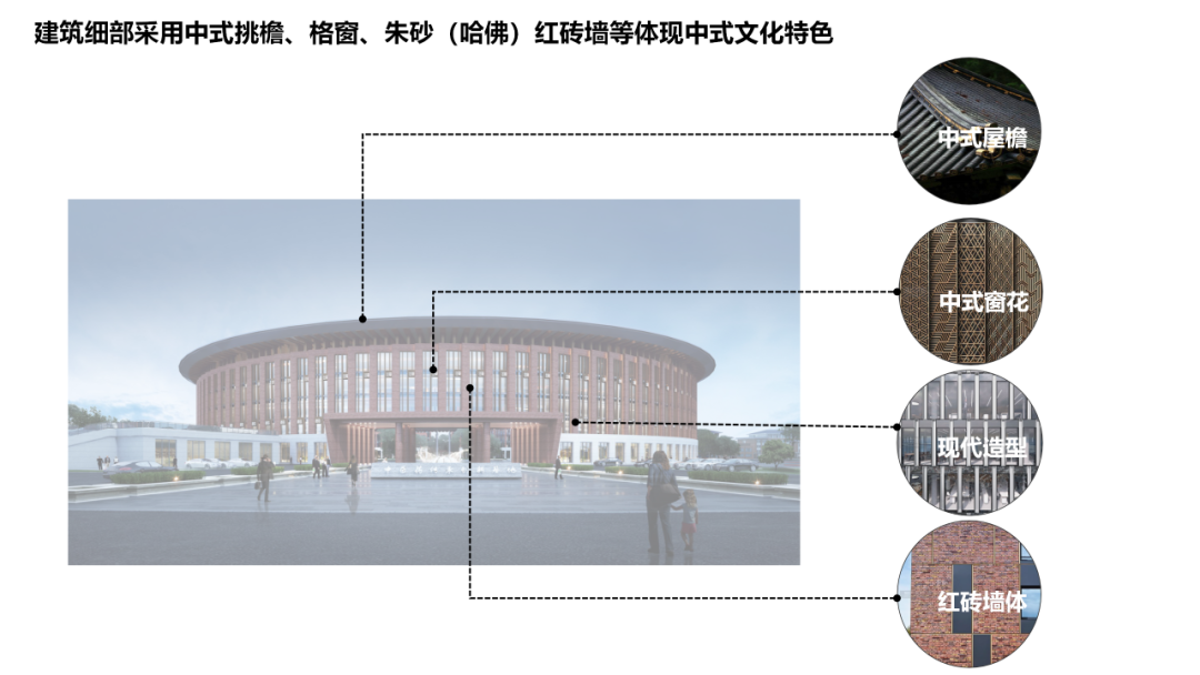项目立面设计延续传统中式建筑的庄重气质,以米色仿石材、红砖、真石漆等材质营造沉稳典雅的视觉效果,巧妙融合现代建筑语汇与传统建筑神韵。