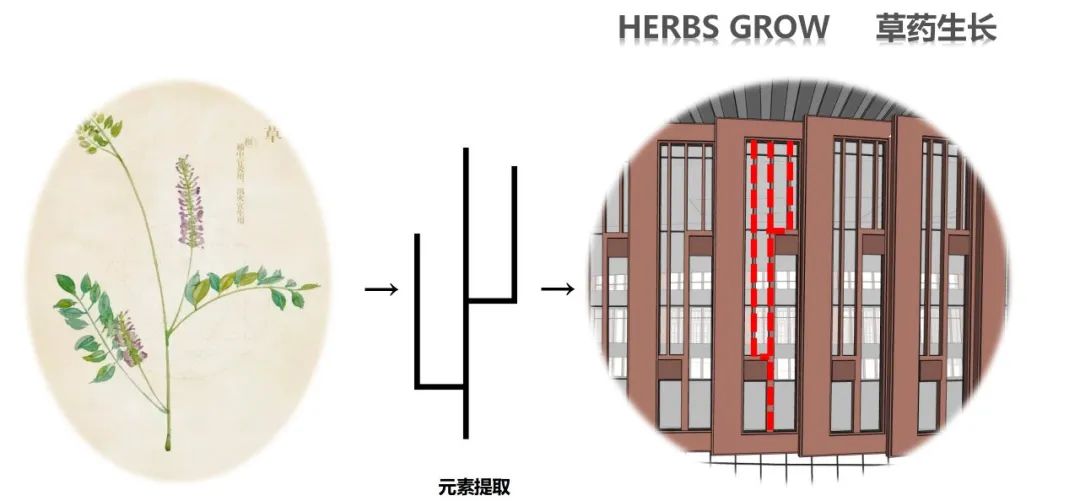 科研保障楼:作为园区的最高点,延续了园区红白相间的色彩,交替向上延伸的立面形式营造出强烈的竖向律动感与生长态势,呼应了草药生长的寓意。塑造出沉稳、典雅且不失活力的建筑形象。