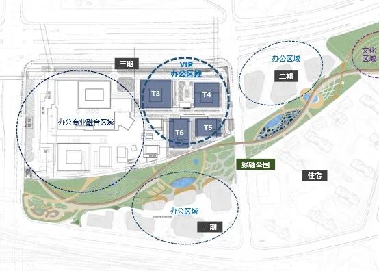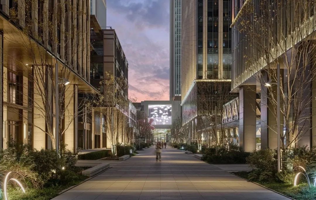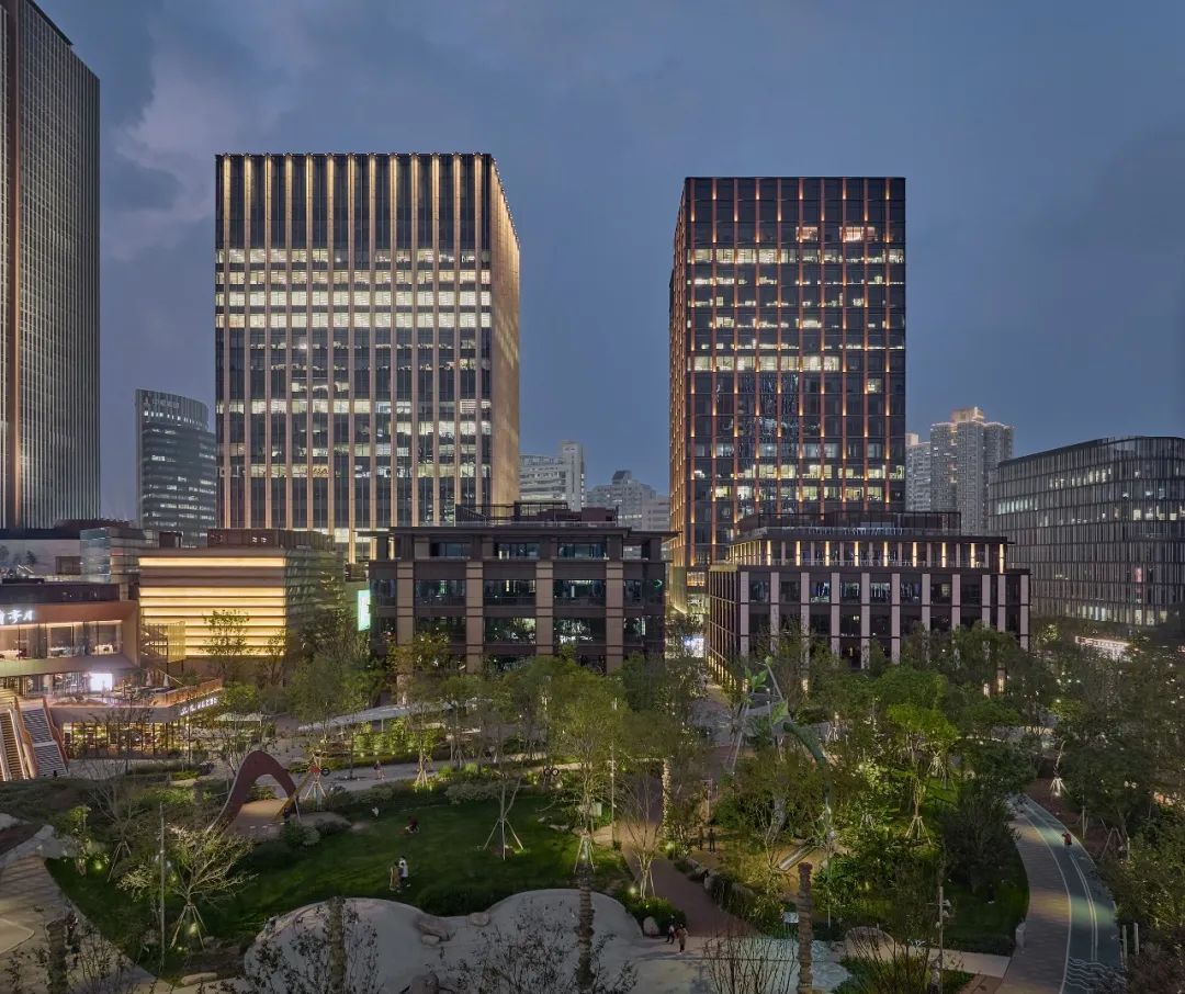 东区四座现代化办公建筑通过商务休闲轴、西区都市活力轴及景观休闲轴三条功能互补的轴线系统,巧妙串联起已有开发项目与绿轴公园景观带。这种多轴线联动设计既打造了宜人的步行友好型街道空间,又借助休闲座椅、景观小品和互动装置等城市家具,促进了商务人士、居民和游客的多元社交互动,使分期开发的项目在空间形态与功能体验上浑然一体,最终形成融合自然生态与都市活力的特色空间。