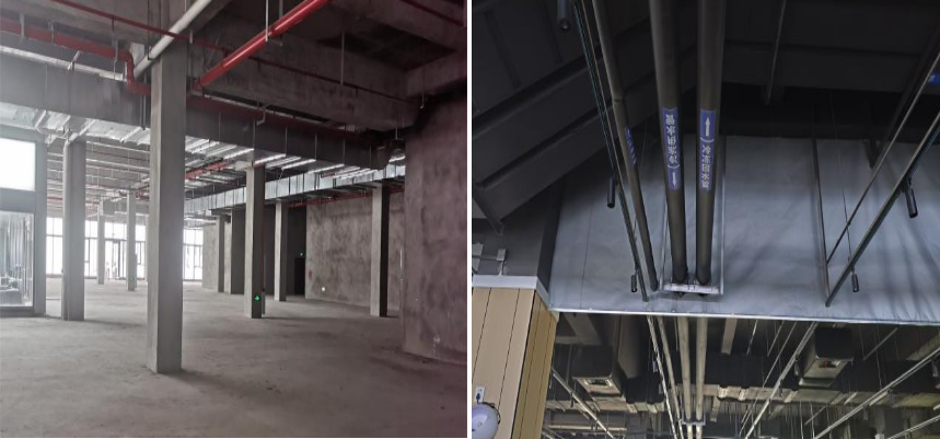 本项目创新采用“全专业前置协同”工作模式,在设计阶段即实现建筑、机电、装饰等多专业一体化配合。机电专业在装饰方案初期即深度介入,通过需求前置整合,从源头避免装饰返工风险。暖通专业通过既有建筑承载力校核与设备选型联动,确保新增设备基础荷载完全匹配原结构条件,规避不必要的结构加固费用。给排水专业与装饰设计协同优化,保留并利旧80%原有喷淋系统,以此降低单项工程成本。电气专业在消防报警、照明配管等专项设计中,精装区域管线明敷于吊顶内,非精装区域管线采用贴顶板敷设方式,此设计具有安装便捷、施工高效、造价节约等优势。