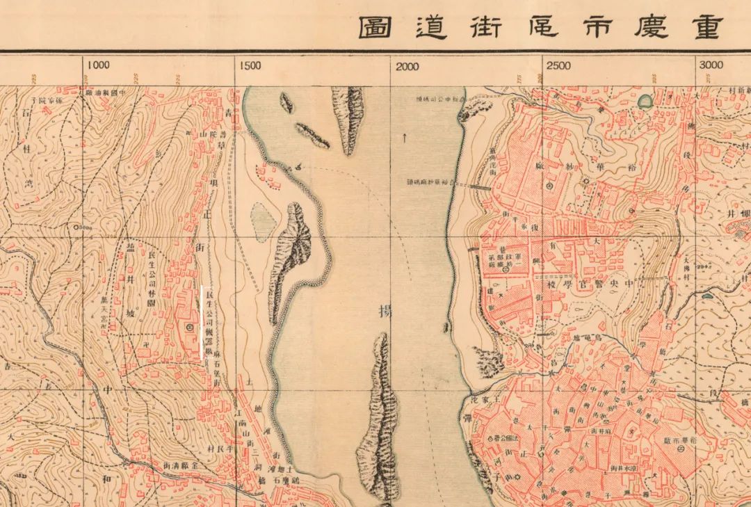 2024年初春,重庆江北区,朝天门长江大桥头,第一次踏勘现场。面朝建设场地与开阔江面,我手中拿着两张图:一张是现状地形图,另一张是1946年《重庆市区街道图》。在那张抗战胜利不久绘制的地图里,我当时所在的位置,还没有跨江大桥、滨江干道、轨道交通、高楼住区……有的是江滩礁石、跌宕地形、建筑聚落。江水依旧,地名仍在,既熟悉,又陌生。图中江畔青草坝,纵列着一排文字——“民生公司机器厂”。