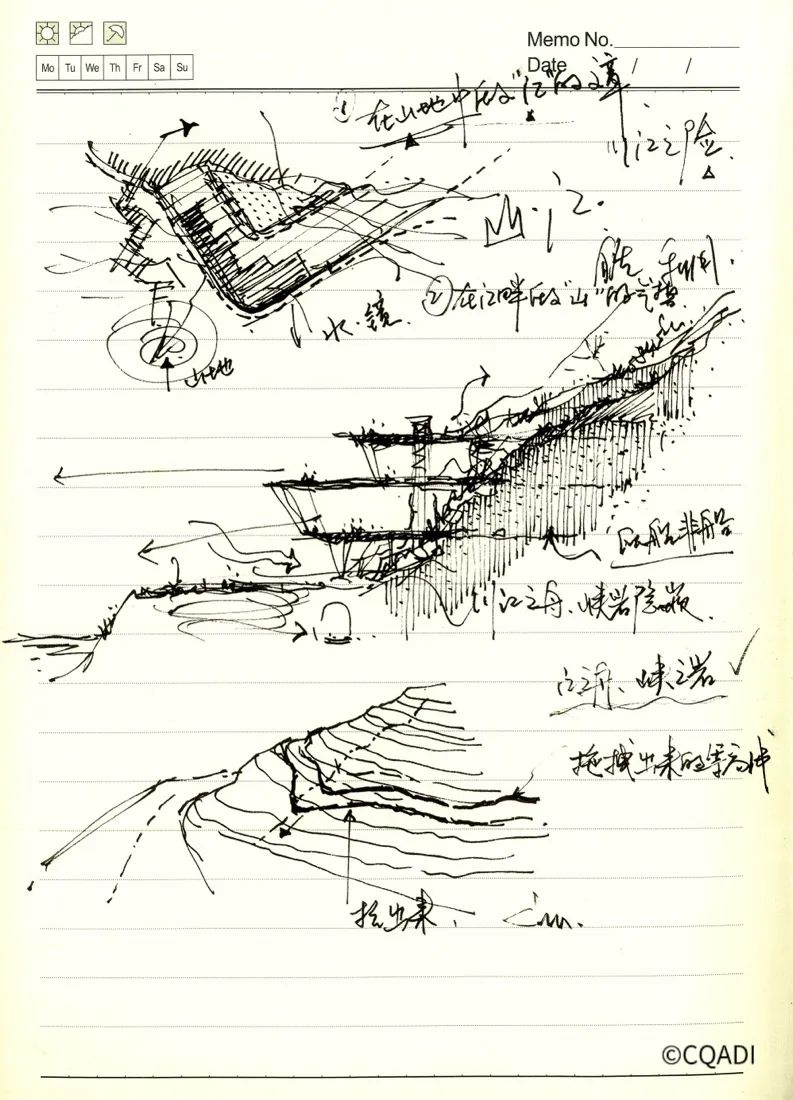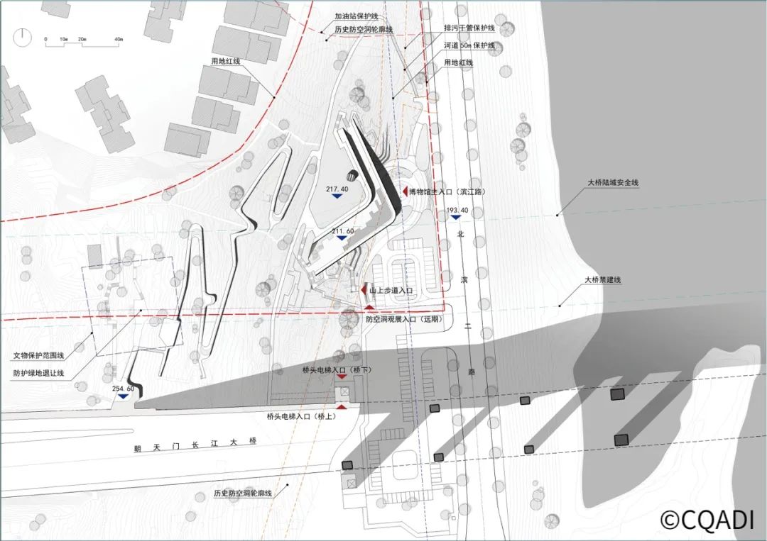 在这块位于重庆两江四岸核心区,看似普通却意义非凡的场地上,未来的川江航运文化应如何表达,精神如何传承?进入人防洞穴(原机器厂地下车间)踏勘,为躲避轰炸,这里曾隐藏机器设备,日夜奋战,为抗战胜利、物资运输、人员转移付出热血甚至生命……在滚滚川江与峥嵘历史面前,设计究竟能够表述些什么,如何反映自然、历史、未来?如何处理场地、技术、文化、精神?如何看待险要、苦难、隐蔽、光明、和平?……
