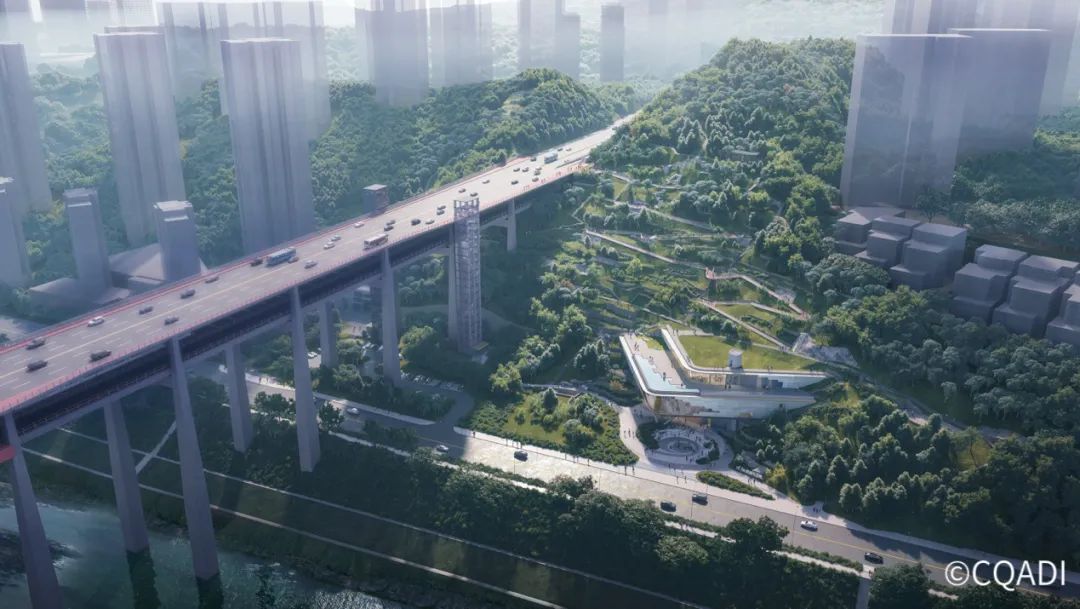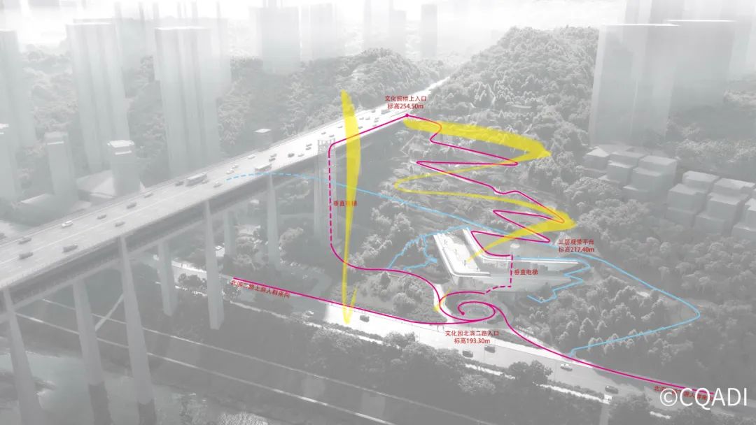 文化公园利用自然地形,与朝天门大桥连通一体,将山体路径与大桥电梯上下结合,如草书汉字——“江”,形成一条首尾衔接、串联紧密、上下联动的山地慢行体验,形成城市中的“立体川江”,结合旋涡主题下沉广场、人防改造建筑、保留建筑改造院落、人行天桥、现建筑台基遗存,策划了峡江险流、抗战到底、国人精神等不同主题山地游园路径。