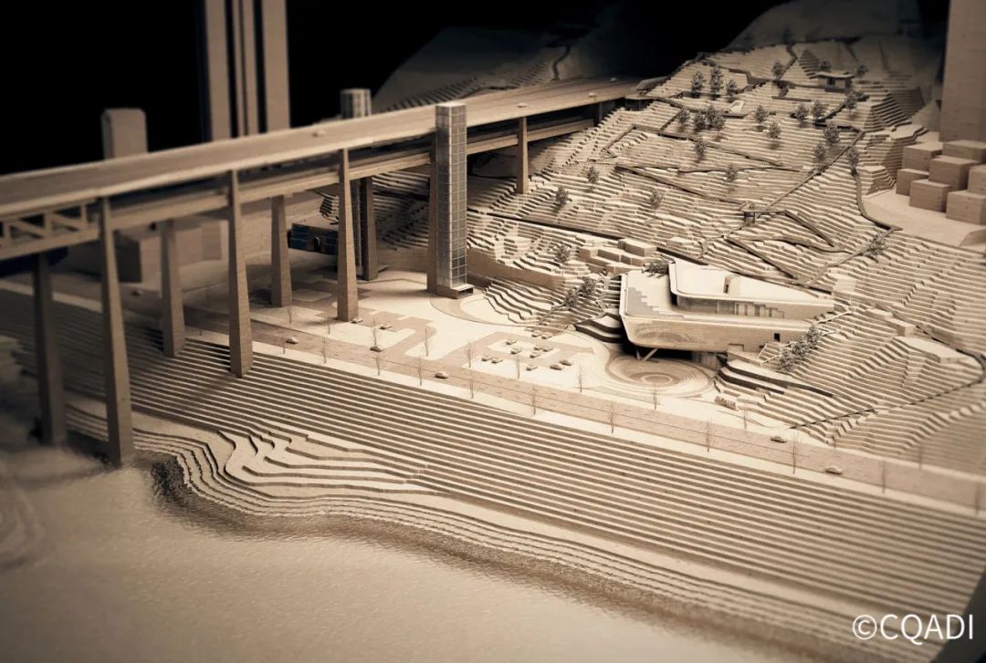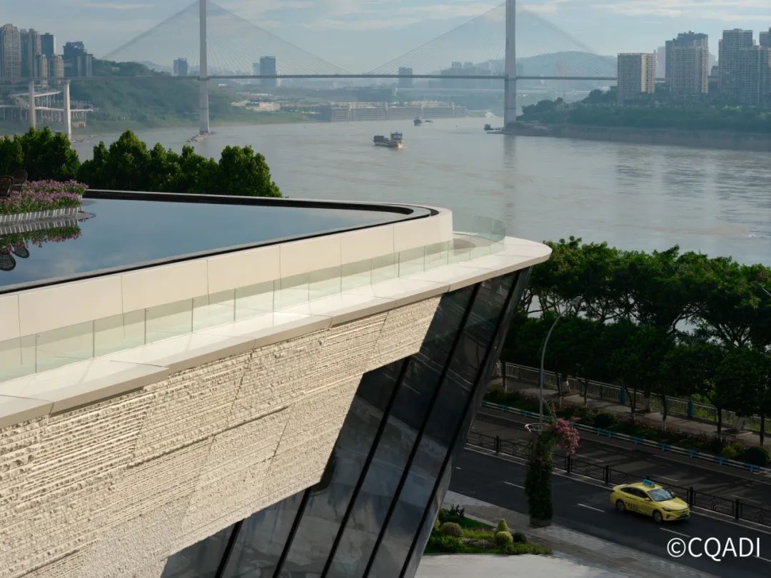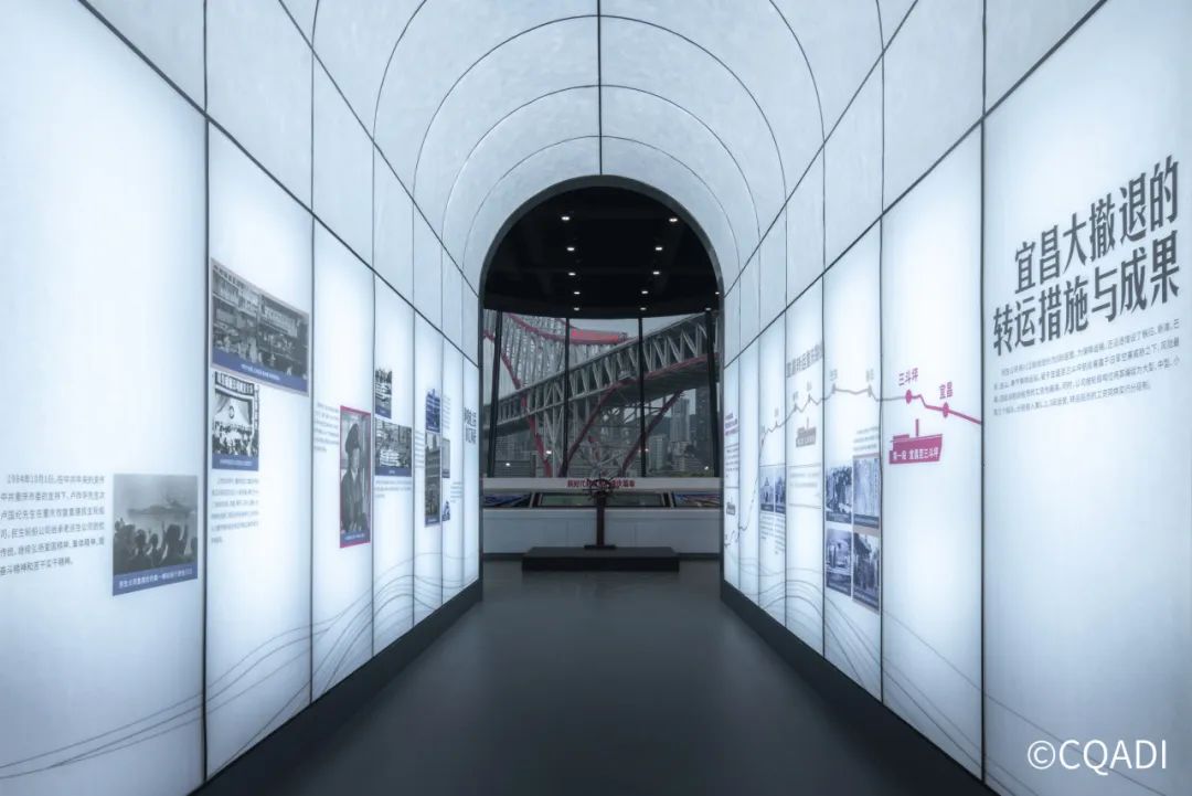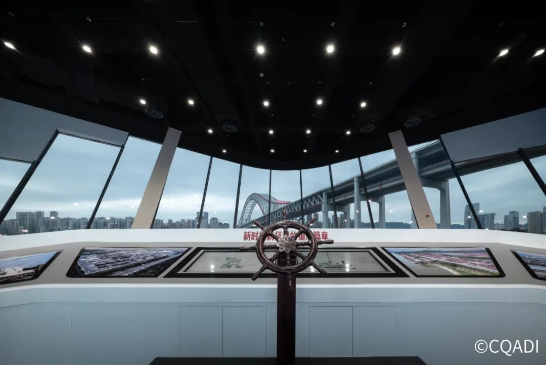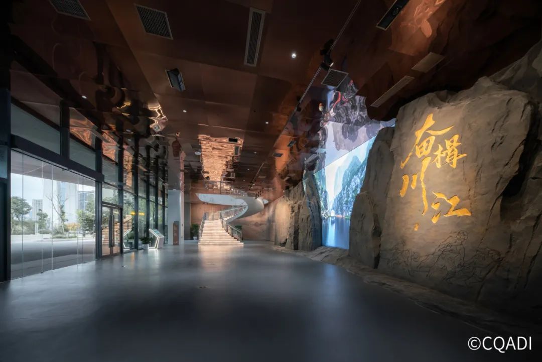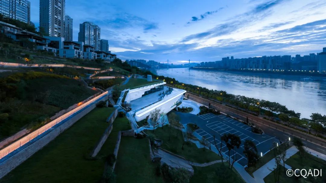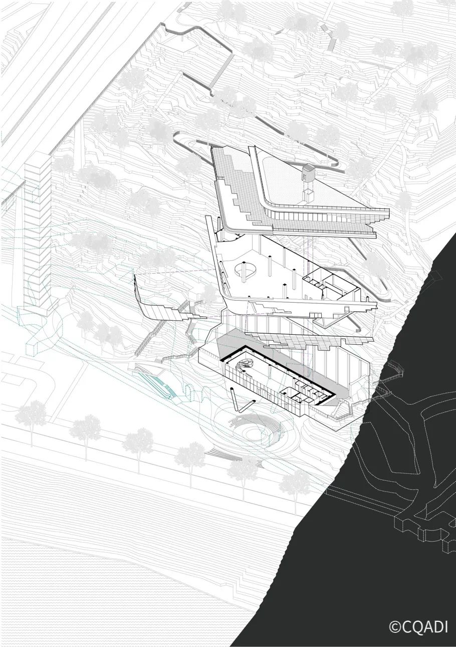 主入口处,以江面旋涡为主题塑造入口广场,致敬川江航运穿越激流险滩的艰难历程,同时也为未来条件成熟时,作为进入地下防空洞展厅预留下沉入口。建筑主体形成双层揽景平台,既立体衔接山地公园,又为眺望大城大江,感受当今和平繁华创造了空间,也由此建立起历史与未来间的世纪对话。