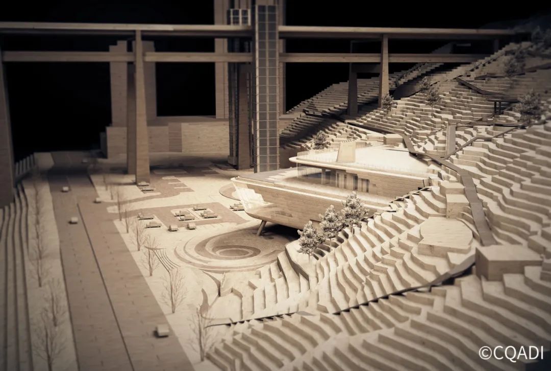 设计中,研习文献,意外获知了一件古法治滩细节——蜀郡太守李冰在川江上游治滩时,采用古老的“堆木烧石”之法,江中礁石在冷热交替中逐层剥落,最终拓开航道,保障行船。基于此景展开构想,将建筑主体由山体逐层推出,手工打凿的外墙挂板由粗及细,分三种顺次层叠,最终形成透明光洁的建筑前端,如昂扬船头之态争先向前、破石而出。
